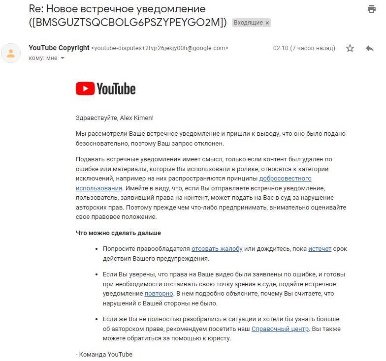 Разумеется я тут же написал возражение администрации Ютуба, подробно объяснив, что я - автор текста и заказчик аудио и иллюстраций. После этого, будучи уверенным, что ошибка будет оперативно исправлена, отправился спать.