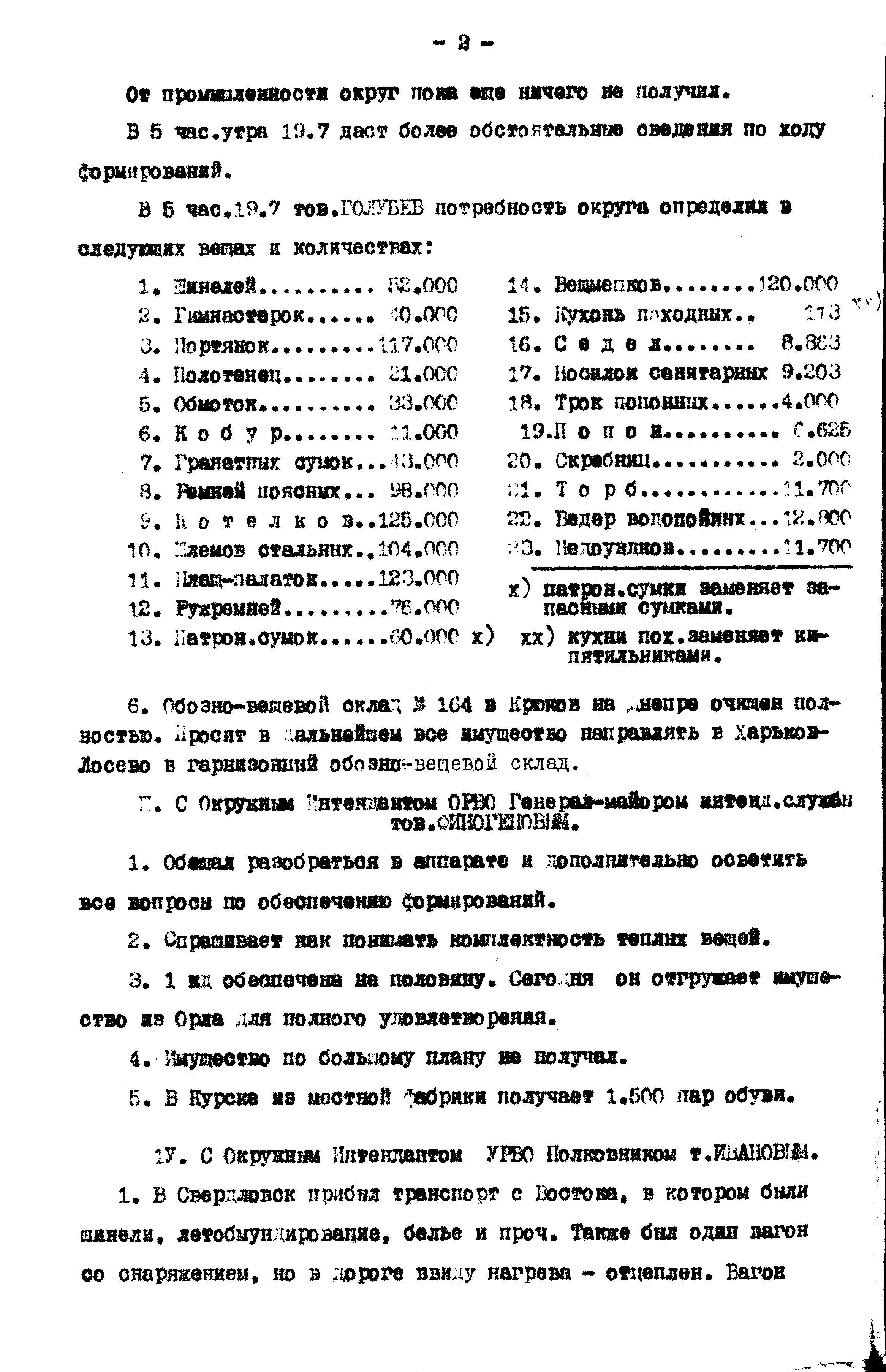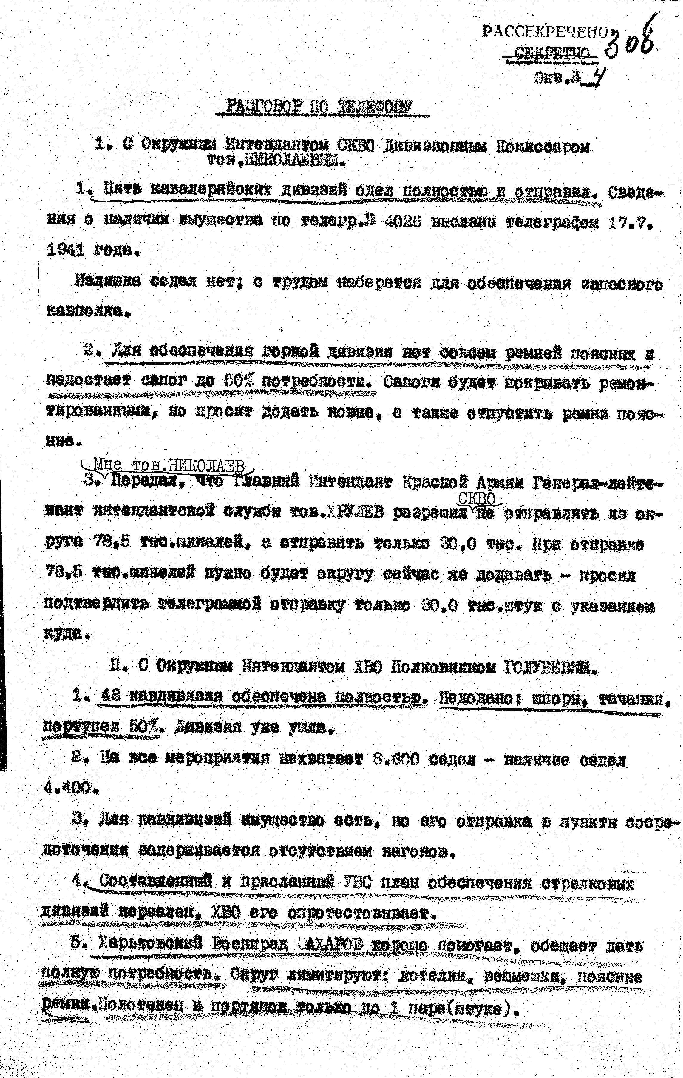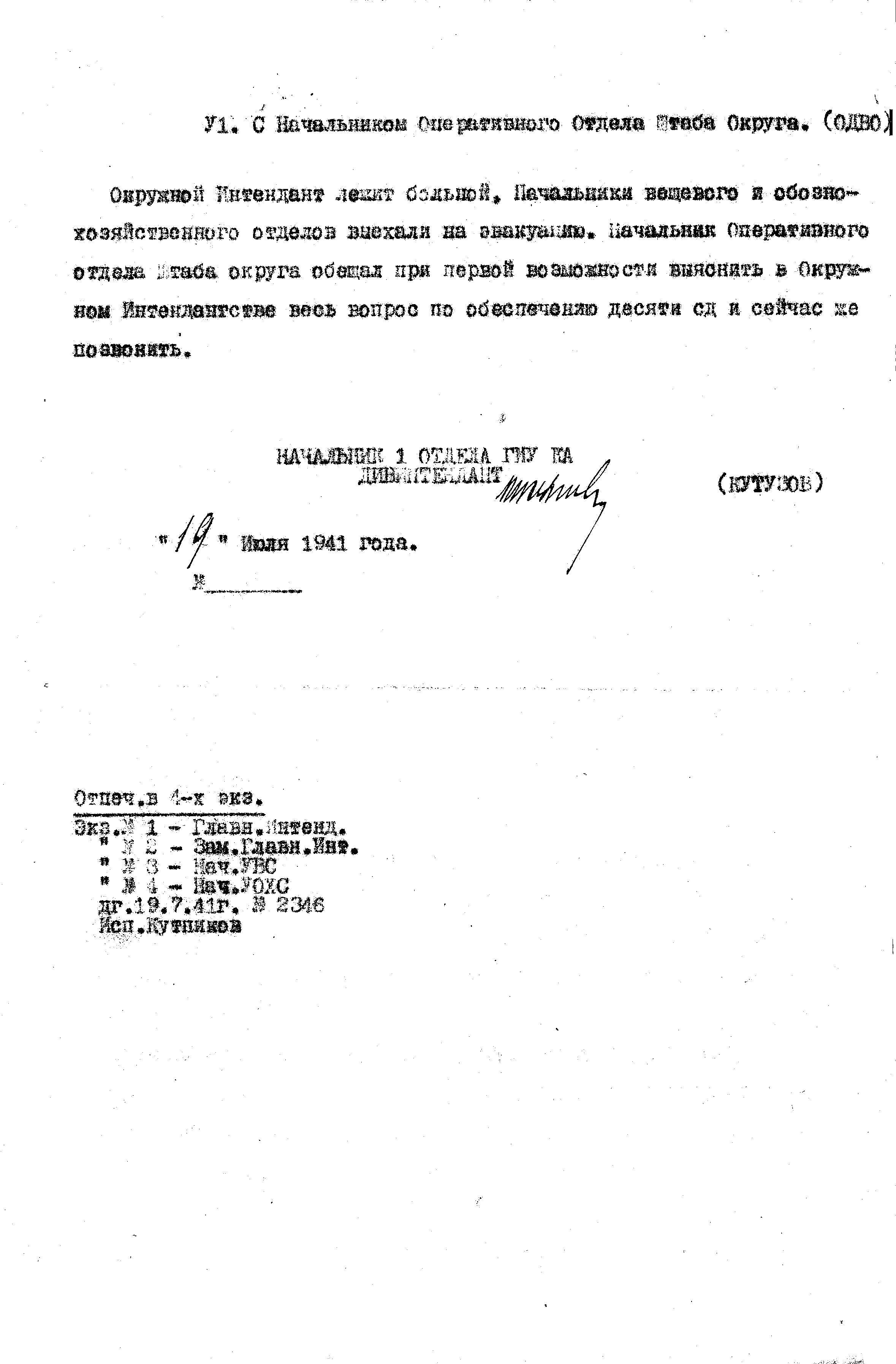 д/с: Телефонный разговор 19 июля 1941 г. между начальником 1 отдела Управления вещевого снабжения КА и интендантами округов