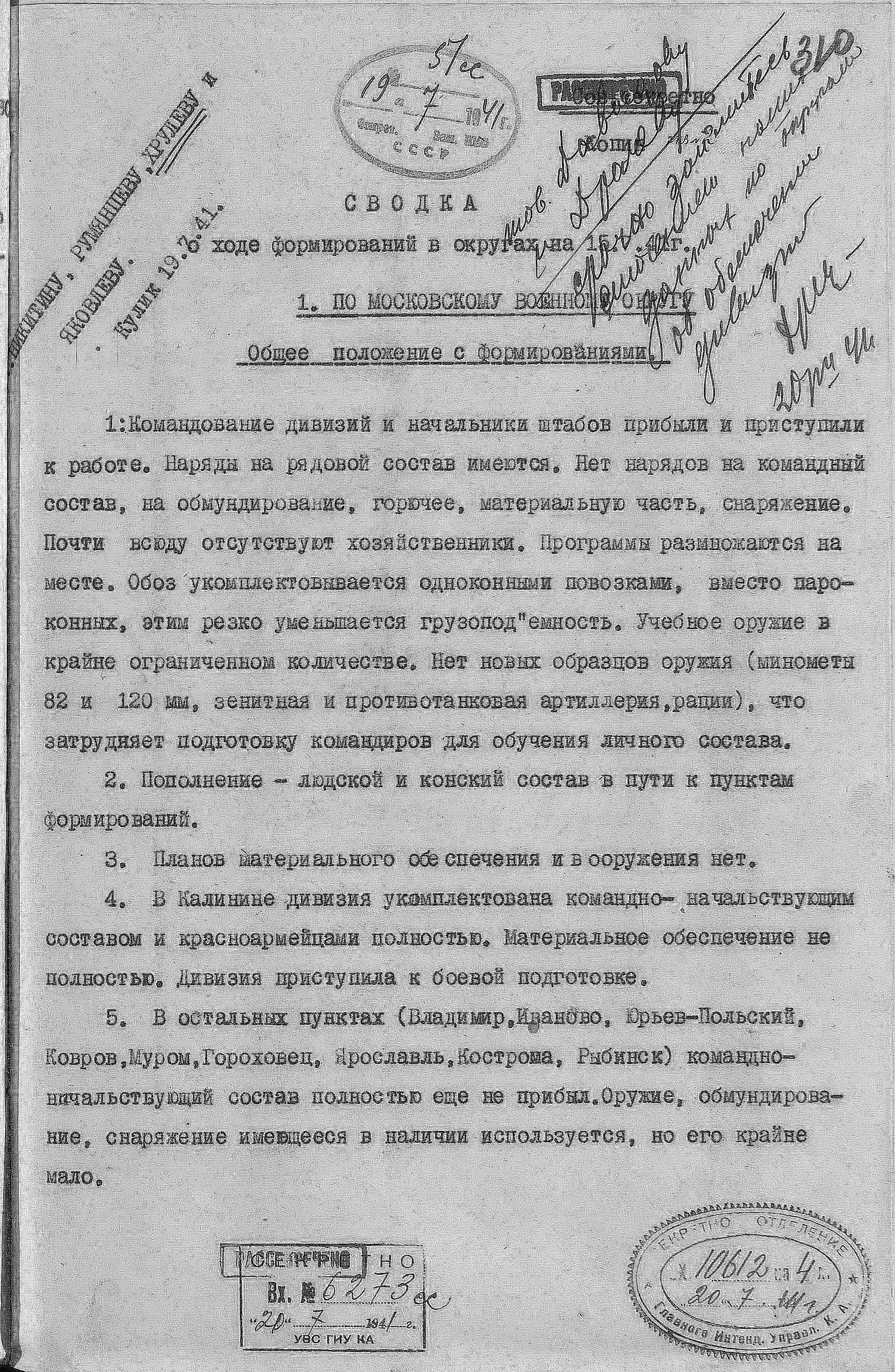 Д/с: сводка о ходе формирований в округах на 15 июля 1941 г.