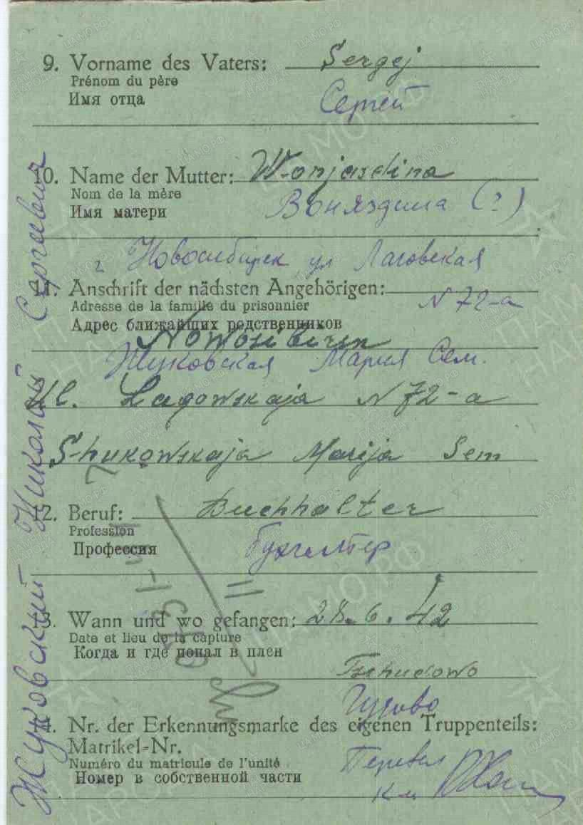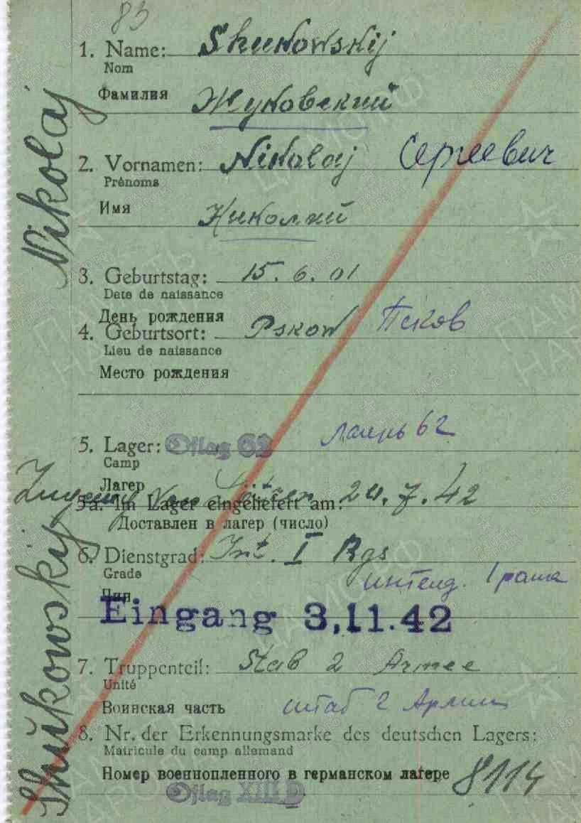 Интендант 1 ранга Жуковский Николай Сергеевич, с апреля 1941 г. – начальник отдела Управления вещевого снабжения. В ноябре 1941 г. также убыл на фронт, интендантом 26 армии. В 1942 г. назначается интендантом печально известной 2 ударной армии. 3 ноября 1942 г. – попадает в плен. О его дальнейшей судьбе мне не известно, каких-либо отметок в личном деле нет, свидетельств о его переходе на сторону врага я не нашёл. Буду благодарен, если кто-либо поможет прояснить его дальнейшую судьбу.