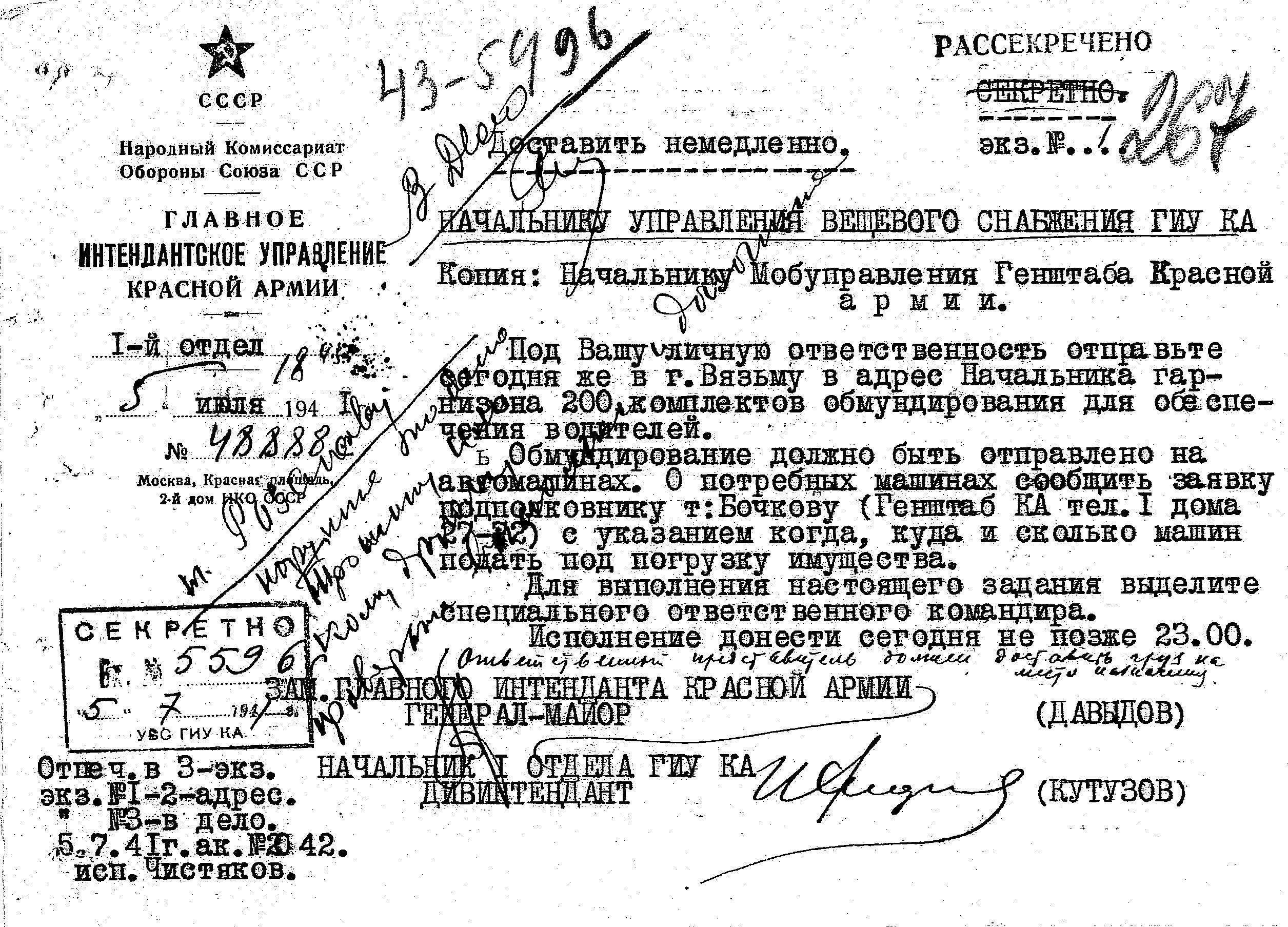 Д/с: указание об отправке 200 комплектов обмундирования для водителей