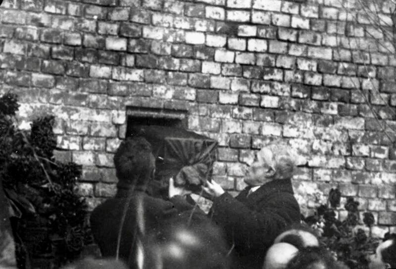 5 апреля 1925 года, размещение урны с прахом в Кремлевской стене. Едва ли не единственный снимок, на котором запечатлен этот процесс. Предполагается, что на фото снят момент захоронения "товарища Левы" - зампредседателя ВСНХ СССР Мирона Владимирова. Это захоронение стало первым в самом знаменитом советском колумбарии.