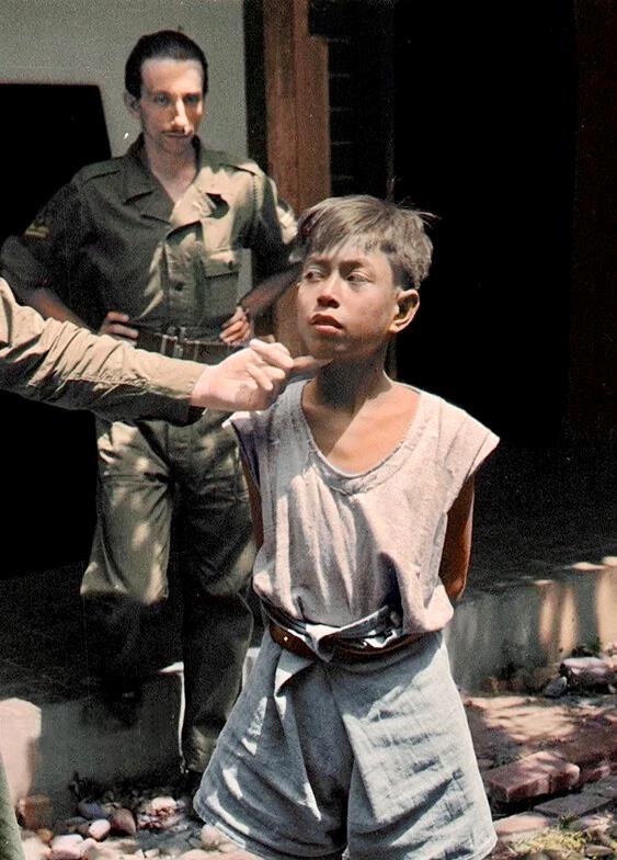1945-1949 года, Индонезия, голландские солдаты допрашивают индонезийского мальчика из партизанского отряда во время Войны за независимость Индонезии.