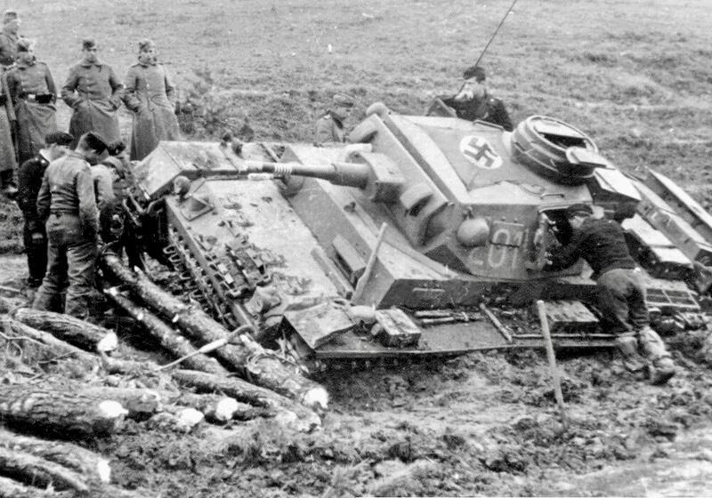 Октябрь 1941 года, танк PzKpfw III Ausf.G (как мне кажется), застрявший на одной из подмосковных дорог. Маршал Распутица в бою.