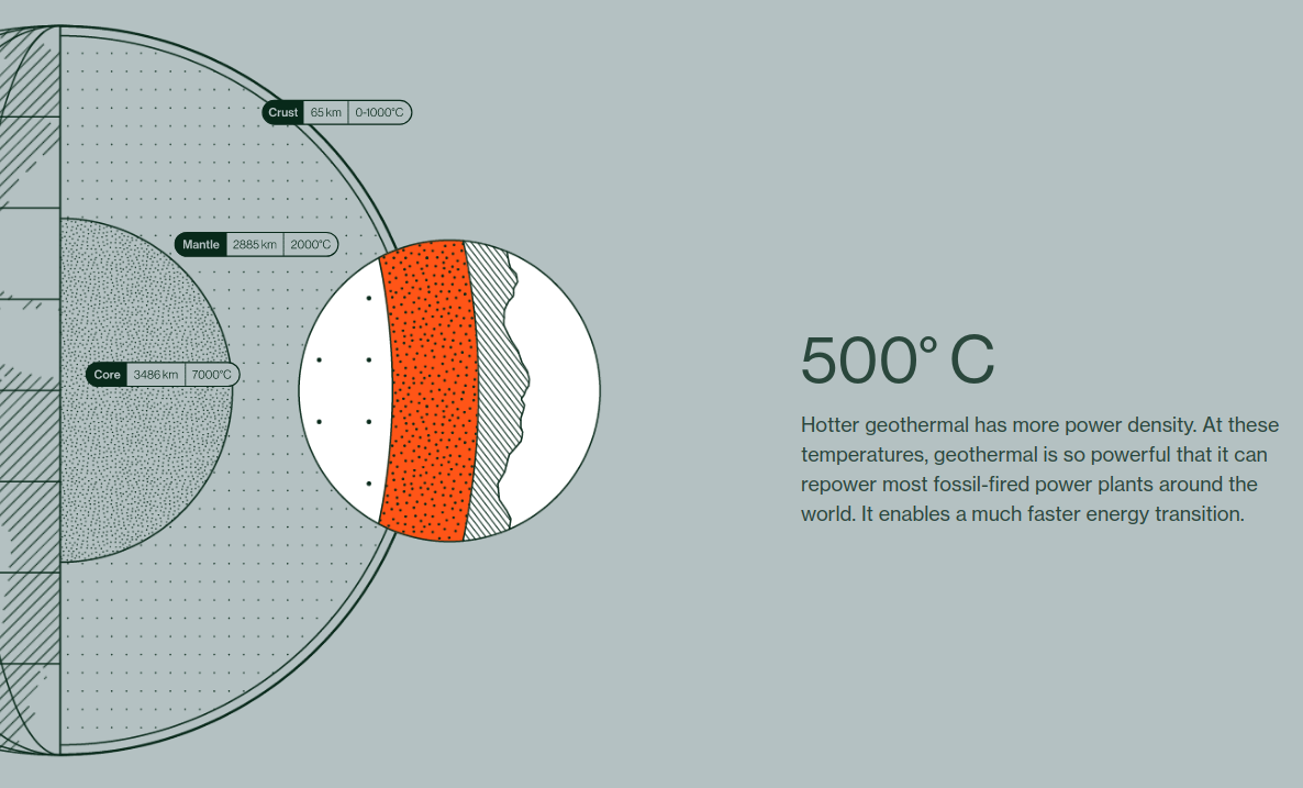 Идея в том, что на глубине 20-ти км температура коры достигает 500 градусов Цельсия, а значит позволяет делать ТЭЦ, не сжигая топлива. Запустили — и работает! Кроме того, стартап собирается переоснащать уже существующие ТЭЦ на геотермальные, чтобы легко и быстро переиспользовать уже существующую инфраструктуру по подаче энергии потребителям. И вот это — ооочень многообещающая штука