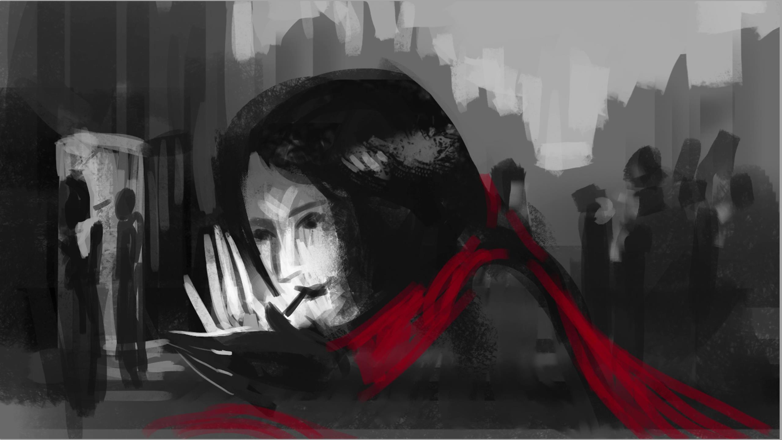 Выделение шарфа как детали красным — идея, конечно же, из "Города Грехов". Его оформление — как накидка, как бы сплетенная из кровеносных сосудов в игре "Мор", на куртке Самозванки, только в форме, которая может напомнить зрителю Многогранник, а может и не напомнить.