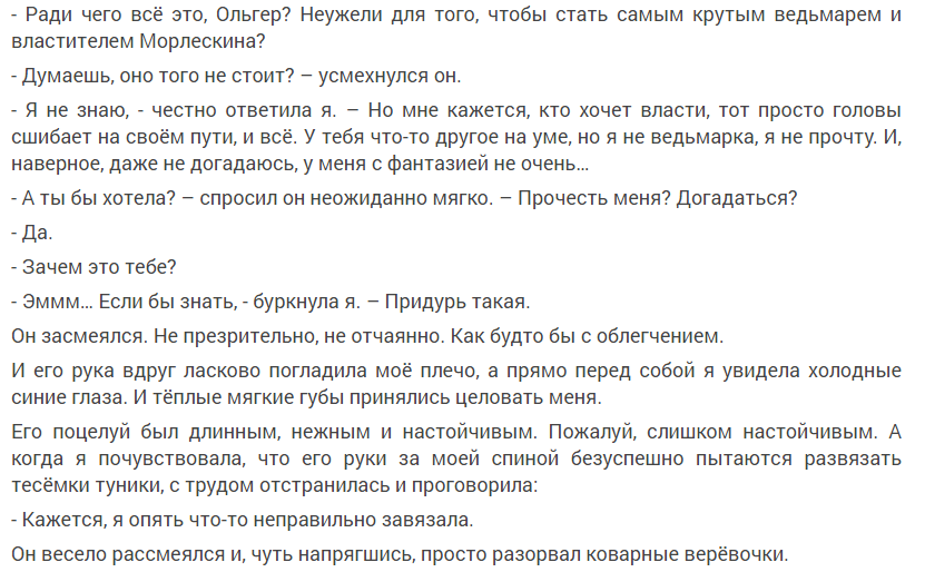 Так же хочу сказать, что скрытого эротизма в книге много, что естественно, когда в сюжете фигурируют маги-метаморфы, которые много раз превращаются из людей в зверей и обратно, не задействуя в сём колдунстве одежду. Но мастерство писателя состоит в том, чтобы подать материал так, как требуют законы жанра, в данном случае — «романтического фэнтази», чтобы ни в малейшей степени не оскорбить и не смутить нежных читателей.