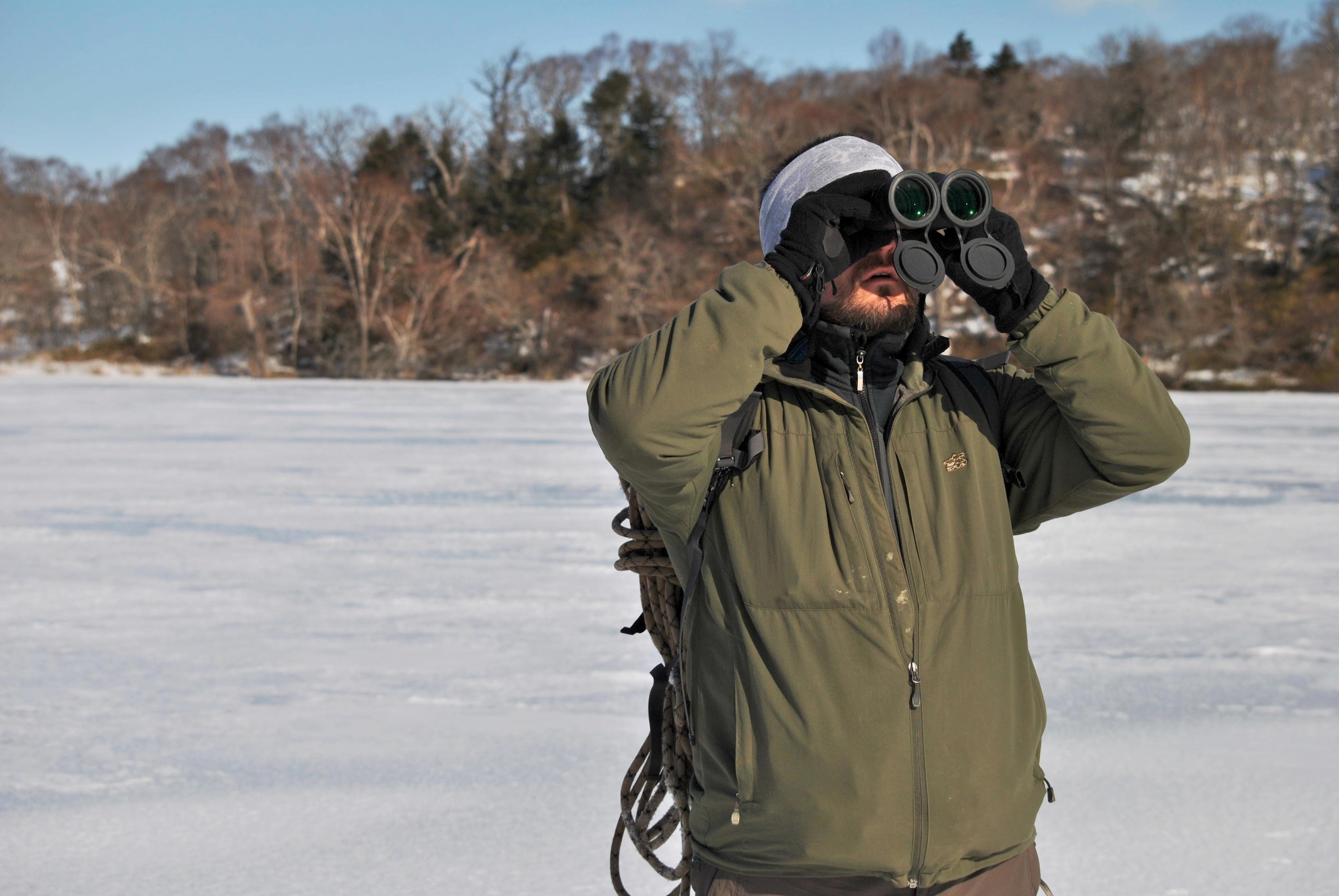 Я в образе, так сказать. Пытаюсь найти хоть какое-то движение. Но из-за того, что озеро замерзло целиком, а рыбы в этом году как-то совсем не особо, вокруг основной акватории - ни одной летающей души. Разве что пара ворон мелькнула, вездесущих. Но они нам особо не интересны.