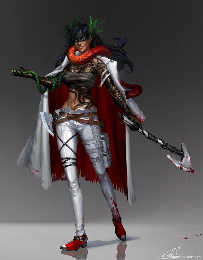 «Coatlicue» - мать-змея, богиня из ацтекской мифологии, символ начала и конца. Живя в России, я знаю очень мало о Мексике, если не считать нескольких стереотипов. Так что моя Мексика - наркобаронесса, опасная, красивая и порочная. Стройная и высокая, она любит носить классический мужской наряд, как любой первоклассный преступник. На ее теле - тематические татуировки ацтеков и майя. Ей нравится быть элегантной, она не любит пачкать руки и одежду грязной работой - для этого есть подчиненные. Но если уж приходится, то это будет кроваво, зрелищно и больно. Вот для чего нужны топоры. А еще она специалист по ядам - как для лечения, так и для убийства. Змея - настоящая и очень ядовитая. У Мексики есть территориальные споры с красоткой США, но приходится признавать силу последней. Можно сказать, что они сотрудничают (в строительстве стен и т.д.), но, скорее всего, убьют друг друга при первой же возможности.