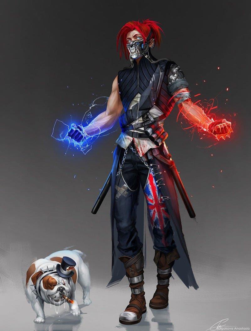 Меня попросили не делать Англию слишком стереотипной, с чаем, королевской семьей и "Аббатством Даунтон". Что ж... Моя Англия - свежая, молодая и дикая панк-культура и рок-музыка. Англия горячая, гордая, ревнивая и импульсивная. Этот парень помнит, каким великим он был, какие славные победы одерживал, но это не делает его слепым или тупым. Он рационален и расчетлив при необходимости, но если в дело вступают глубокие чувства, в нем может проснуться дикий зверь, который устроит кровавую бойню - как это произошло в случае с восстанием его сестры. Англия - старший брат США, хотя его чувства гораздо больше, чем просто братские. У Англии есть курящий и выпивающий бульдог по кличке Черчилль. Настоящий друг, очень верный. Не то что эти колониальные братцы. Хотя это Англия, а не вся Великобритания, я выбрала цвета Юнион Джека, потому что они более узнаваемы. Англия предпочитает кулачный бой лицом к лицу, так что носит кастеты. Его руки могут испускать горячую и холодную энергию, но эти потоки никогда не смешиваются (тут шутка про два крана с водой).