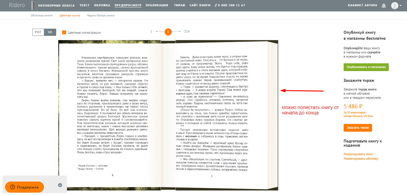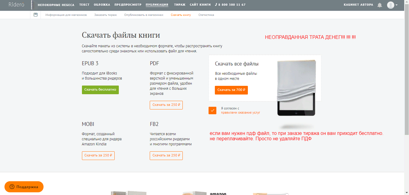 И последнее, что хочу сказать о работе с текстом, - это скачивание книги в электронном формате. Если вам нужен формат ПДФ, то не надо, умоляю вас, покупать там его. Вся соль в том, что Ридеро само вам пришлёт этот файл на проверку при печати тиража даже в один экземпляр. Вы можете его скачать и оставить у себя, щедро пользуясь полновесным свёрстанным текстом. А коль захотите другие форматы, то просто конвертируйте самостоятельно на компьютере. Можно посмотреть ролики на ютубе или почитать про это. Но вкладывать деньги в то, что можно сделать самим (ну или просто в два раза дешевле), - это, скажу я вам, очень недальновидно.