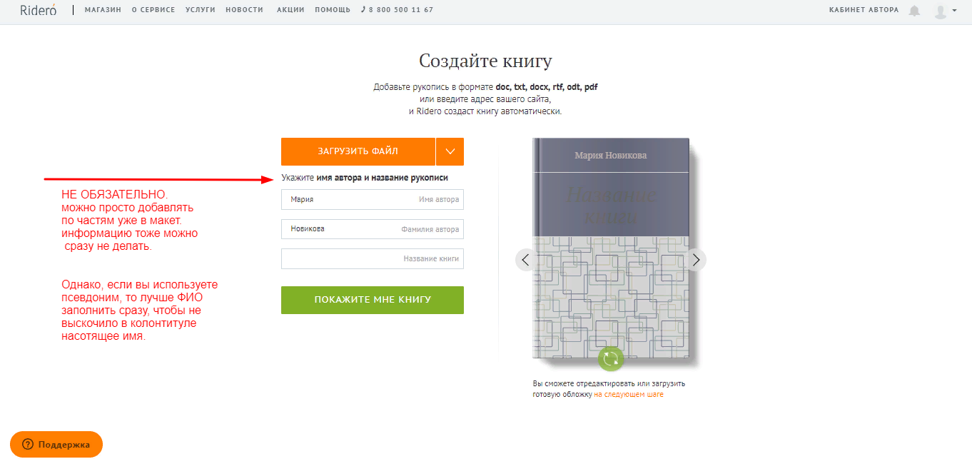 Как видите, всё достаточно просто. Однако тут есть небольшие хитрости. И первая - никогда не надо сразу заливать весь текст в макет. Я долго мучилась с романом, когда поняла, что поступила неправильно. У меня большое количество сносок, а потому мне пришлось в конце каждой главы их выискивать и проставлять заново, это заняло неделю. Так что просто создайте книгу, обязательно написав псевдоним. После заключения договора на публикацию имя будет постоянно всплывать при создании каждой книги. Подмечайте это, чтобы, если вы не желаете светить настоящее ФИО, не попасть впросак.