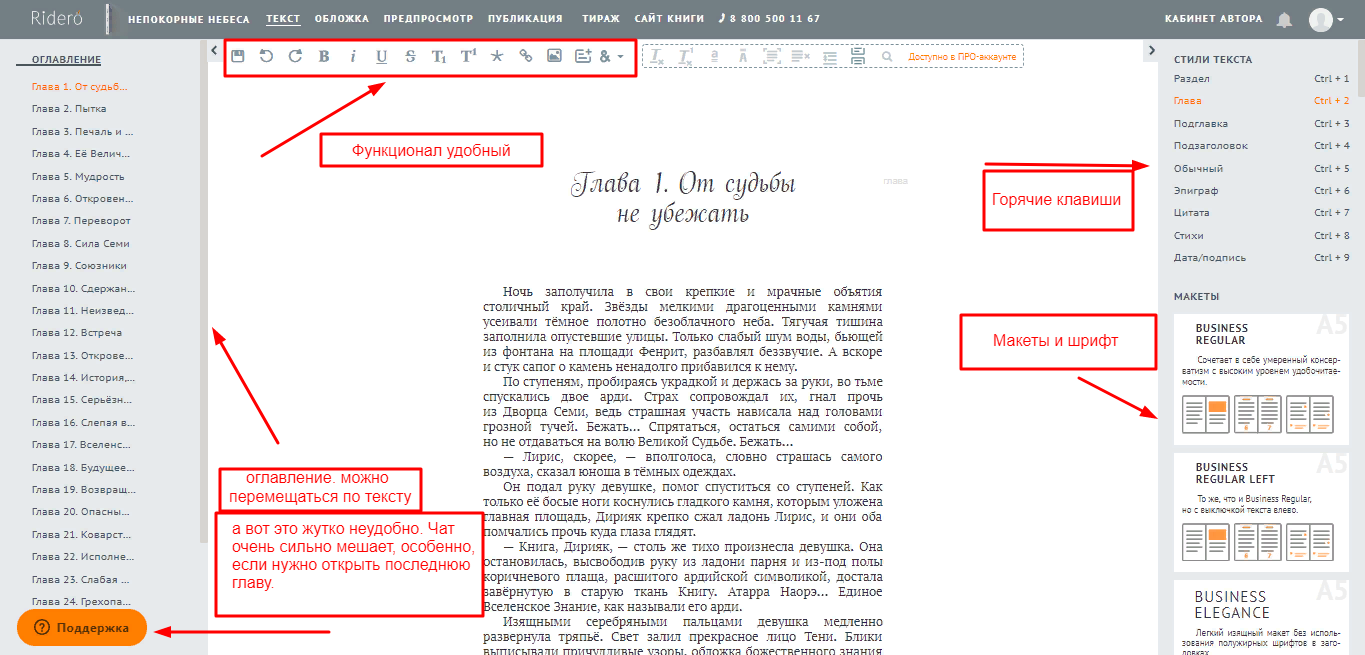 Так же удобно то, что можно перемещаться по оглавлению. Большие романы предполагают наличие большого количества глав, а прокручивать страницу вниз курсором крайне долго и непрактично. Получается намного проще, если кликнуть на нужную главу и начать работать с ней.