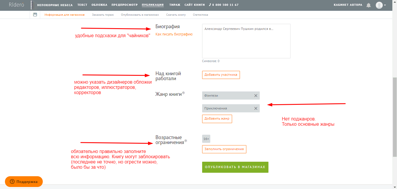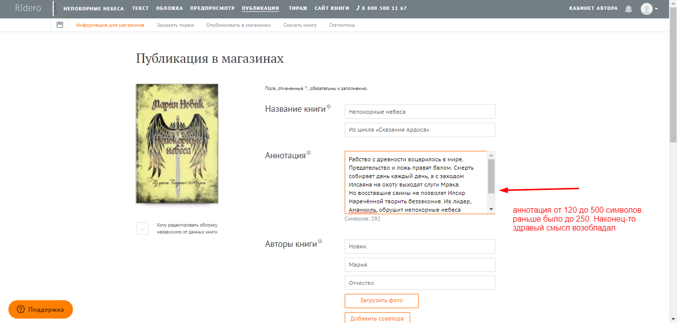 Поля со звёздочкой обязательны к заполнению, так что книгу не пропустят в интернет-магазины, если вы всё не заполните. Что касается аннотации, то сейчас она увеличилась по знакам. Раньше было 250 знаков. Ох и намучилась я с этим делом! Мне всегда хотелось спросить: "Откуда вы, ребята, берёте такие цифры?". Хорошо, что сейчас всё сдвинулось с мёртвой точки, однако для новичка будет трудно впихнуть невпихуемое в 500 знаков. А если бы было 250... Думаю, словарь мата пополнился бы новыми выражениями.