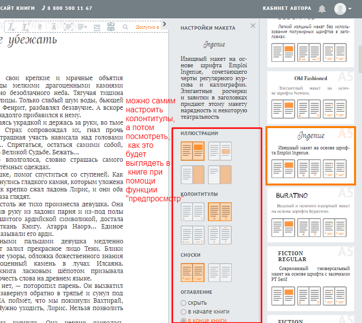 Макеты и шрифт вы выбираете сами. В них есть пояснения, для лучшего ориентирования. Например, для детских книг лучше выбирать макет "Буратино", а для элегантности "Индженуе".