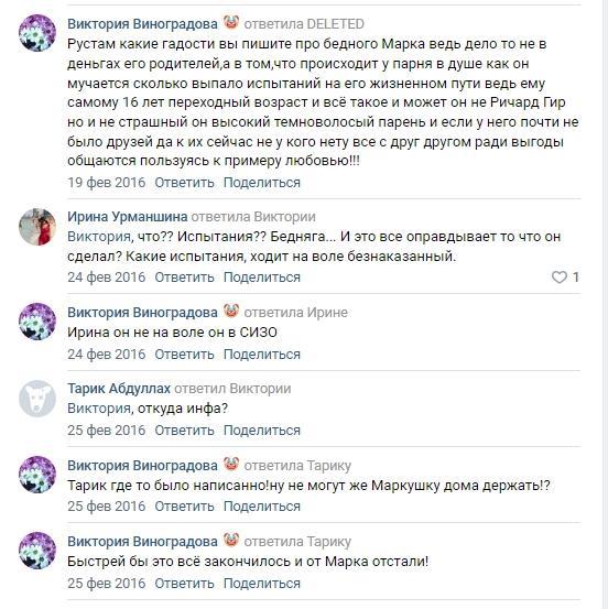 Быстро была создана "Вконтакте" группа в поддержку Марка, на которой окопались два вида комментаторов - платные тролли ( их высеры часто смахивают на бред психически больного- как они только не оскорбляли убитую и её родителей) и фантазёры - их мнение сводилось к примитиву - сама виновата; убийство совершили рейдеры, чтобы оттяпать у отца бизнес. Чёрный пиар шел по полной.