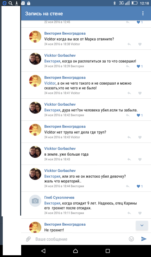 Виктория Виноградова, жительница Новосибирска, являющаяся,по свидетельству местных жителей, провокаторшей в одной из местных групп Вконтакте (КСМ) почуствовала в Марке Конькове родственную душу и бросилась его защищать, прямо таки с голой грудью на амбразуру. Я думаю, что вряд ли защищала она его в интернете из за того, что ей заплатили Коньковы - в то время, как платные тролли уже через год после приговора убийце заткнулись, эта дура продолжает его защищать до сих пор, и ей абсолютно плевать, что он высказывал идеи нацистов, говоря - цитата "русских надо сжигать", а значит, и ее саму! Вот как можно защищать того, кто сам мразь, и других за людей не считает!
