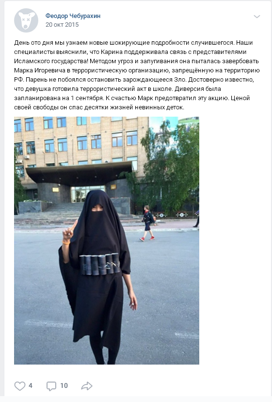 Уроженец Днепропетровска по имени Алекс, видимо, думал, что его настоящий облик никогда не станет известен. Наивный… Нашлись добрые люди и рассказали про него все. Этот урод (в полном смысле этого слова) взял себе псевдоним Фёдор Чебурахин, украл чужую фотографию и давай себя за священника выдавать, параллельно неся просто чудовищный бред про убитую Карину Залесову. Вранье было бесперебойным и изощрённым — девочку и в развратном поведении обвиняли (что является полнейшим бредом — Карина была очень скромной, что подтверждается всеми, кто её знал); и в том, что она, якобы на деньги повелась и рассчитывала в будущем за Марка Конькова выйти — хотя по факту были просто приятельские отношения, которые завершились после того, как мажор стал проявлять всё большую неадекватность и агрессивность. Карина и на день рождения Марка поехала только потому, что он угрожал ей своим самоубийством и тем, что она в этом будет виновата. В конце концов он ее настолько достал, что она не выдержала. И да, никто не спорит, что это было огромной глупостью с её стороны, но кто из нас в юности не ошибался?