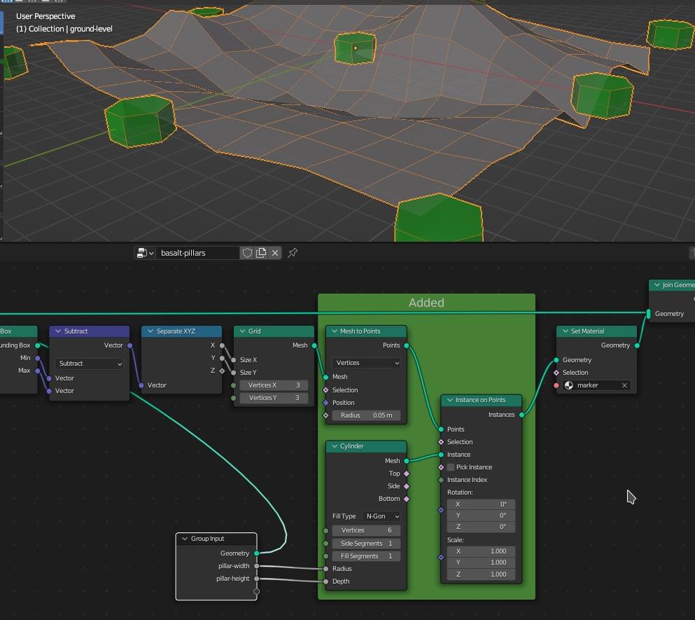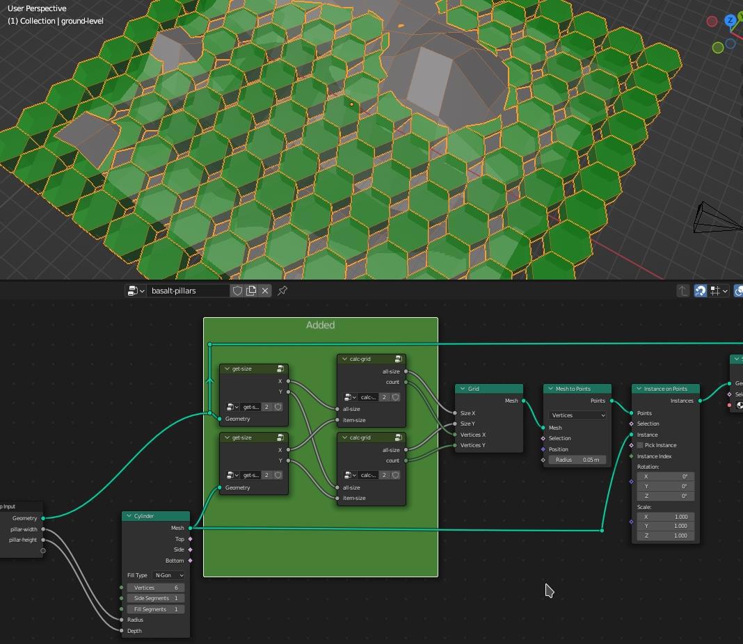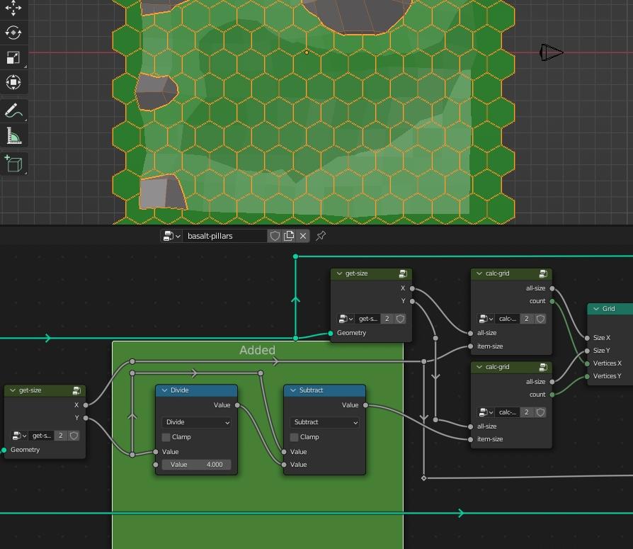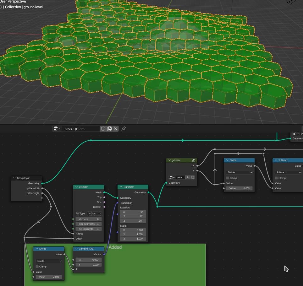 Добавленные ноды (в данном случае вышеупомянутые группы) на зелёном фоне. Мы вычисляем размеры (ширину и глубину, высота нам пока не интересна) входной поверхности и нашего столба. У столба мы задали изначально задавали радиус, так вот, он может не равняться ни высоте ни ширине шестигранника (лень проверять), потому надёжнее взять его размеры.