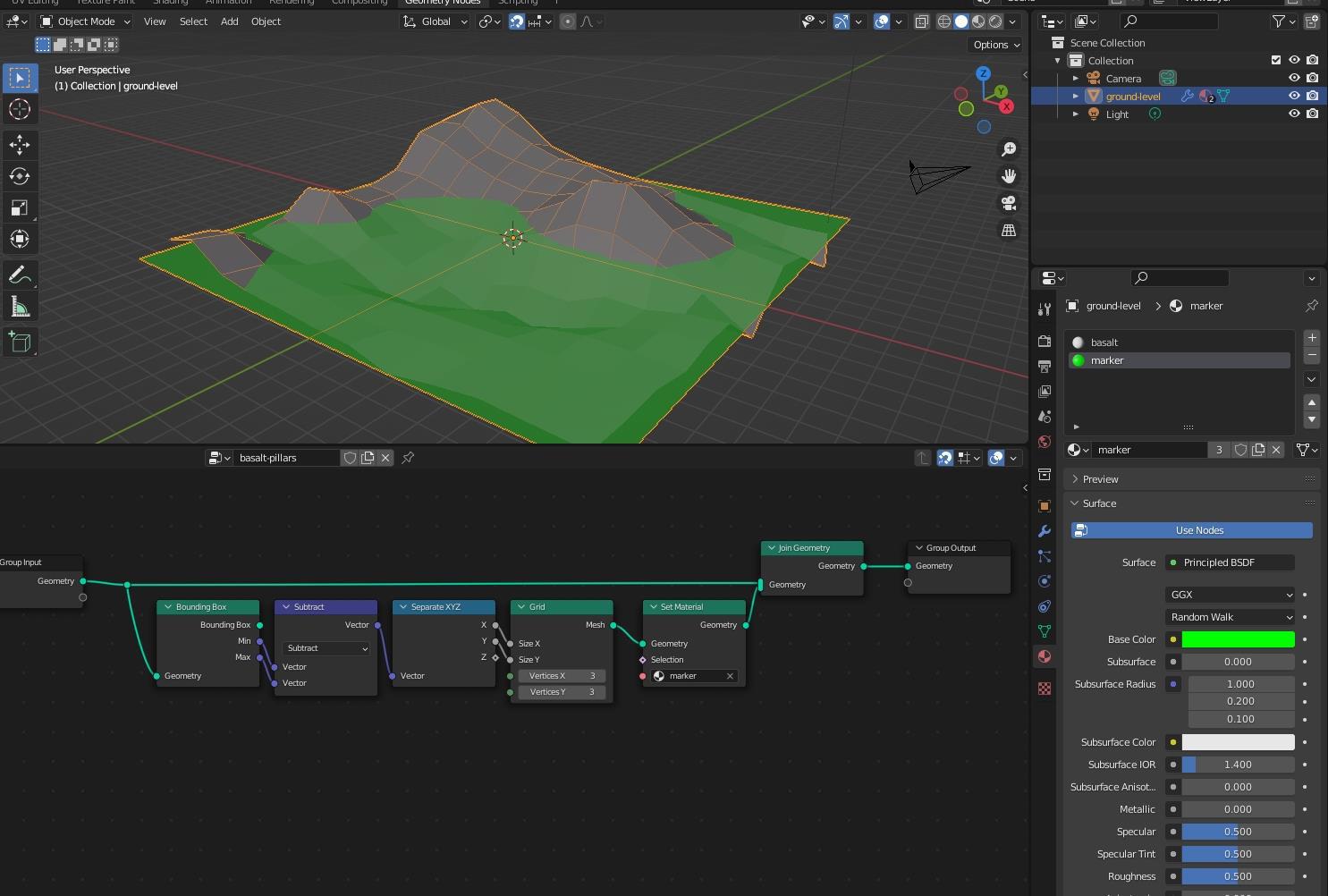 Базовая поверхность здесь серая - на неё добавлен модификатор нод. А всё что создают ноды для наглядности отображено зелёным (это делается специальным материалом и нодой "set material" ).