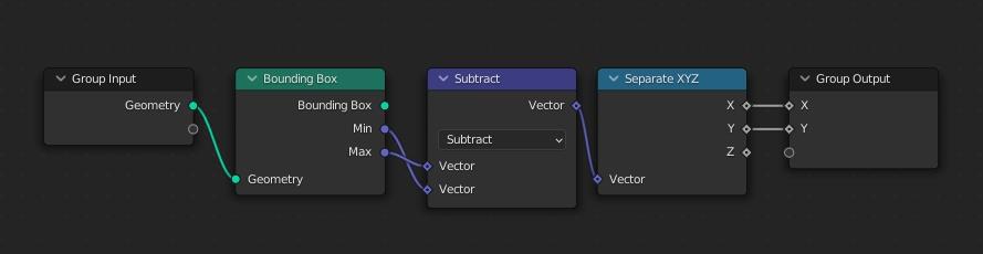 На этом этапе я объединил ноды, вычисляющие размеры, в подгруппу (у неё название 'get-size', далее на скринах она будет под ним). Обратите внимание, тут уже min и max указанны в верном порядке: