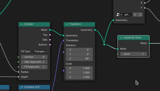 Так как исходная фигура называется cylinder, то она и сглаживается в цилиндр. (О чём я традиционно вспомнил уже в конце.) А нам этого совсем не надо. Чтобы придать фигуре шестигранности, её можно чуть subdivide в самом начале (обратите внимание, что тут разные ноды с похожим названием):