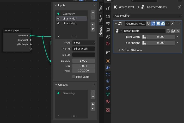 Следующим этапом к группе стоит добавить входные параметры (указанный интерфейс вызывается клавишей N в редакторе нод), в данном случае высоту и ширину столба. Тут неплохо бы указать минимальную границу отличную от нуля. Как показала практика 0.001 - всё же маловато и столбов оказывается многовато, потому лучше указать 0.1