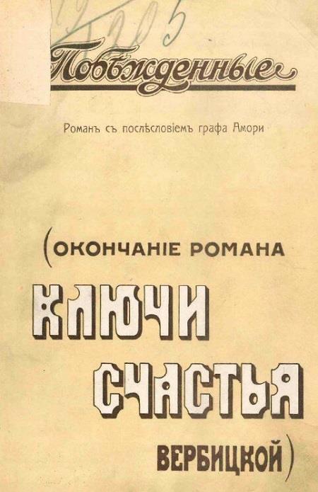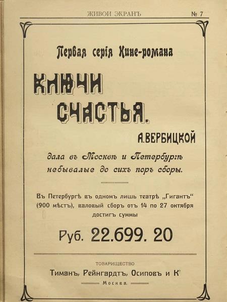 В 1915 г. тиражи книг Вербицкой достигли невероятных для того времени цифр - 280 000 экз. Заоблачные цифры не ограничились литературой. До 1913 года по-настоящему хорошо в России прокатывались лишь иностранные картины, тенденцию сломала лента «Ключи счастья» - экранизация книги, которую сняли Владимир Гардин и Яков Протазанов. Журналисты не уставали удивляться небывалому успеху «Ключей счастья» в кинотеатрах страны, и этот фильм так и остался в истории самой кассовой дореволюционной российской лентой.