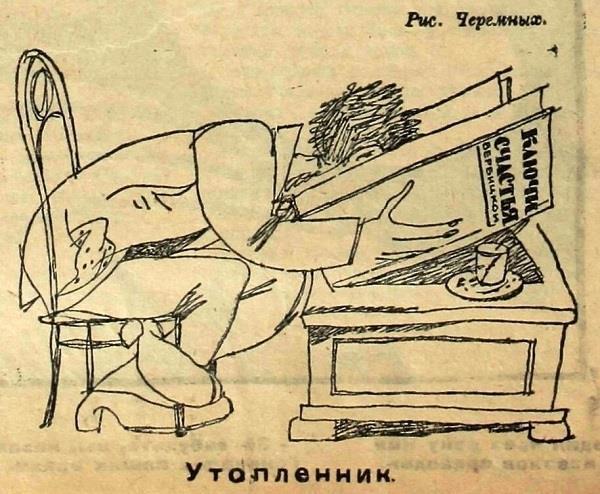 Автор: Вадим Нестеров aka Сергей ВолчокНа карикатуре Михаила Черемных «Утопленник» из журнала "Крокодил" за 1922 год изображен читатель, «утонувший» в книге Анастасии Вербицкой «Ключи счастья».