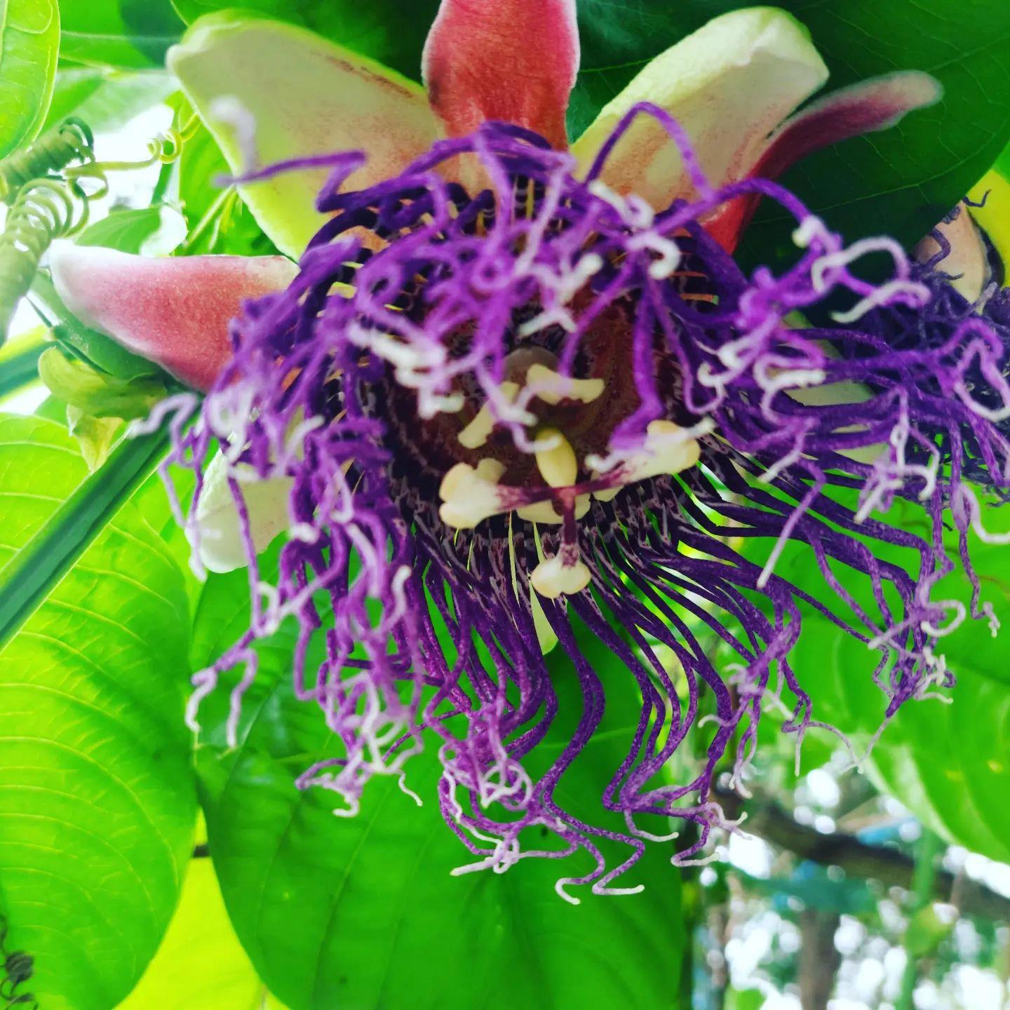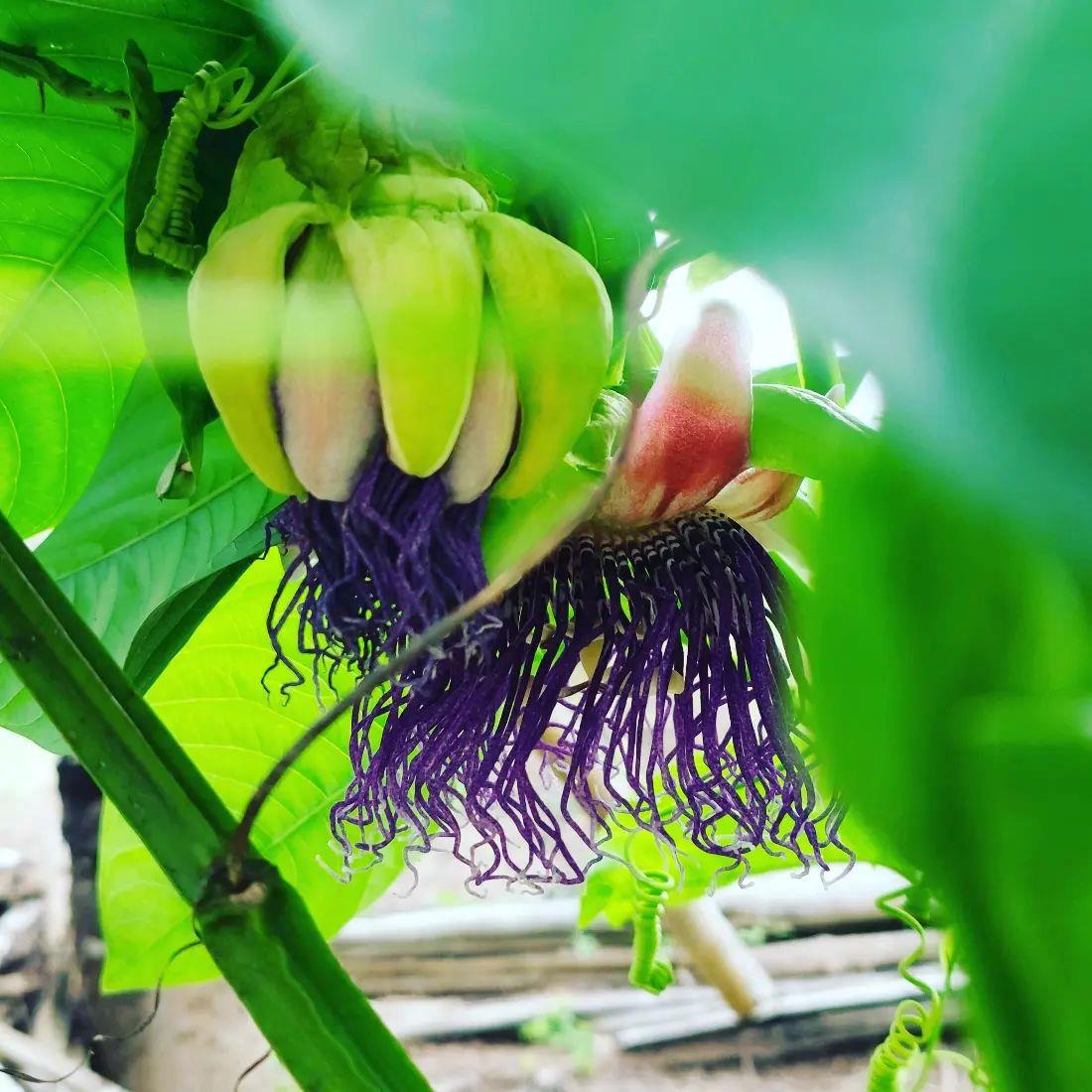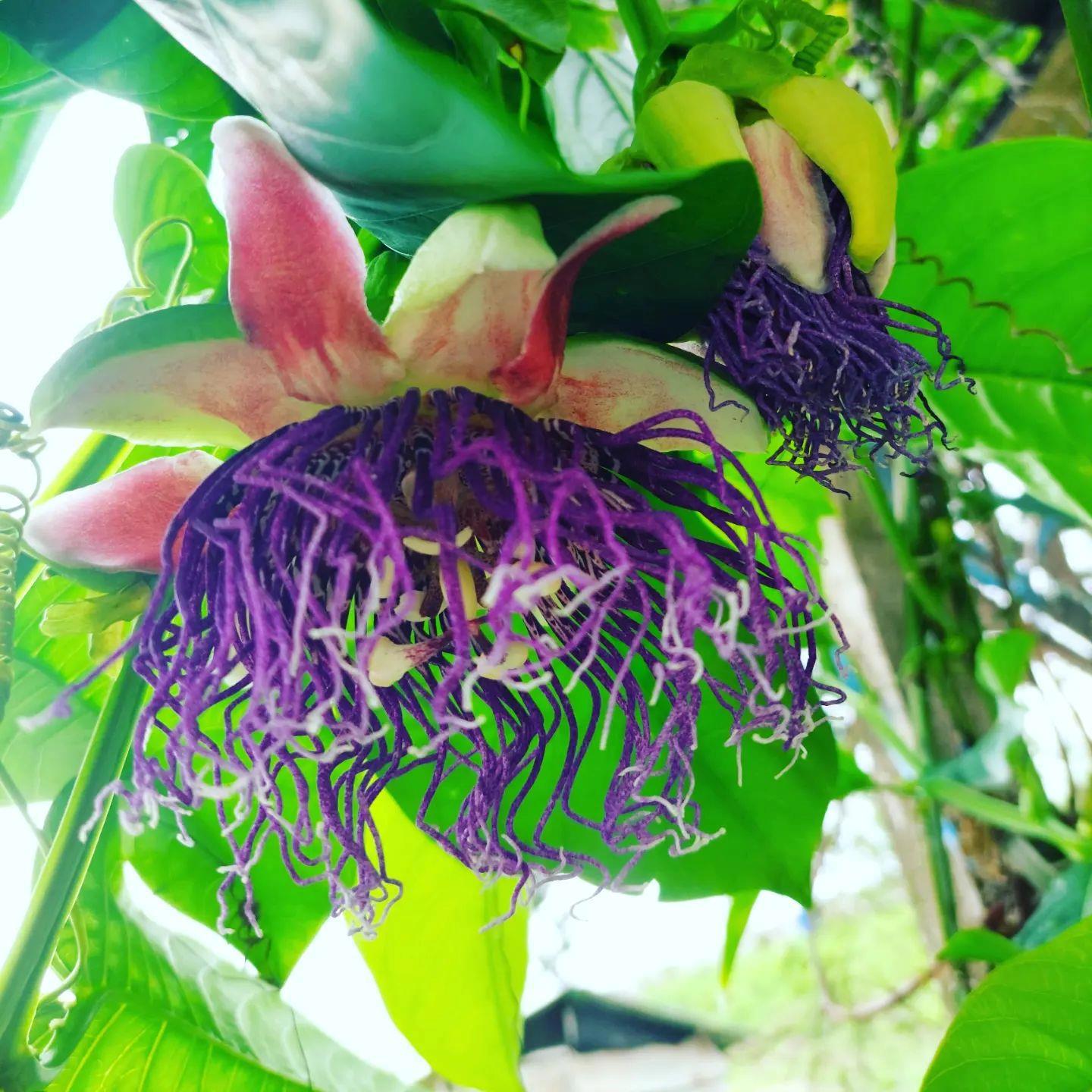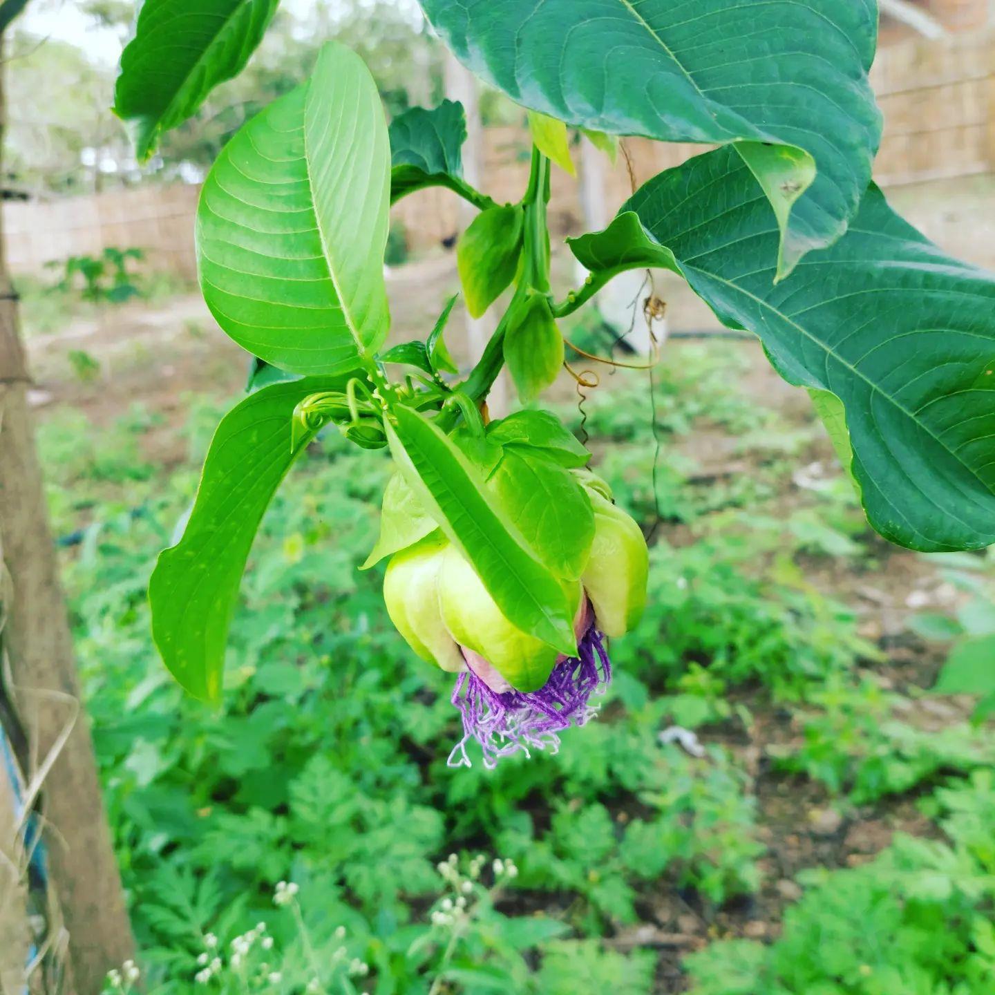 Гигантская маракуйя. Она же страстоцвет четырёхгранный. Она же пассифло́ра четырёхгранная. Она же гига́нтская гранади́лла. Она же то ли бабело, то ли бабехо по-нашему (на слух не распознала).