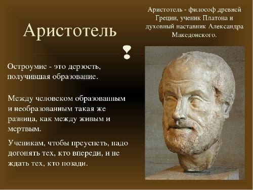Аристотель Дата рождения: 384 до н.э. Дата смерти: 321 до н.э. Аристо́тель — древнегреческий философ. Ученик Платона. С 343 года до н. э. — воспитатель Александра Македонского. В 335/4 годах до н. э. основал Ликей . Натуралист классического периода. Наиболее влиятельный из философов древности; основоположник формальной логики. Создал понятийный аппарат, который до сих пор пронизывает философский лексикон и стиль научного мышления, заложил основы современных естественных наук. Аристотель был первым мыслителем, создавшим всестороннюю систему философии, охватившую все сферы человеческого развития: социологию, философию, политику, логику, физику. Его взгляды на онтологию имели серьёзное влияние на последующее развитие человеческой мысли. Метафизическое учение Аристотеля было принято Фомой Аквинским и развито схоластическим методом. Карл Маркс называл Аристотеля величайшим мыслителем древности.