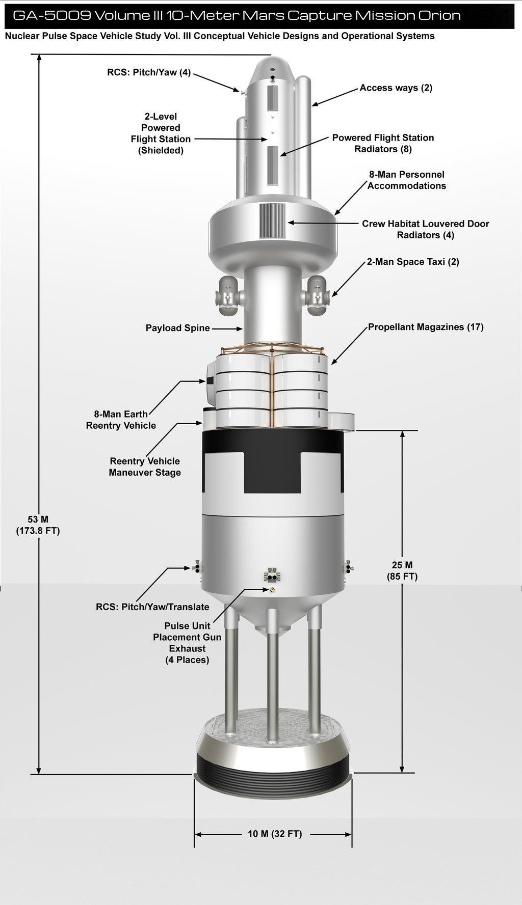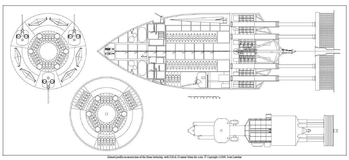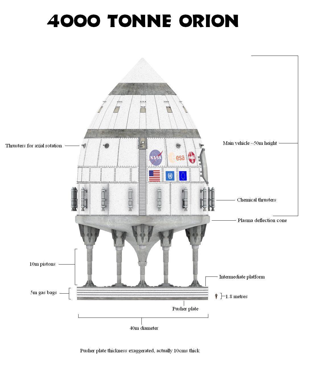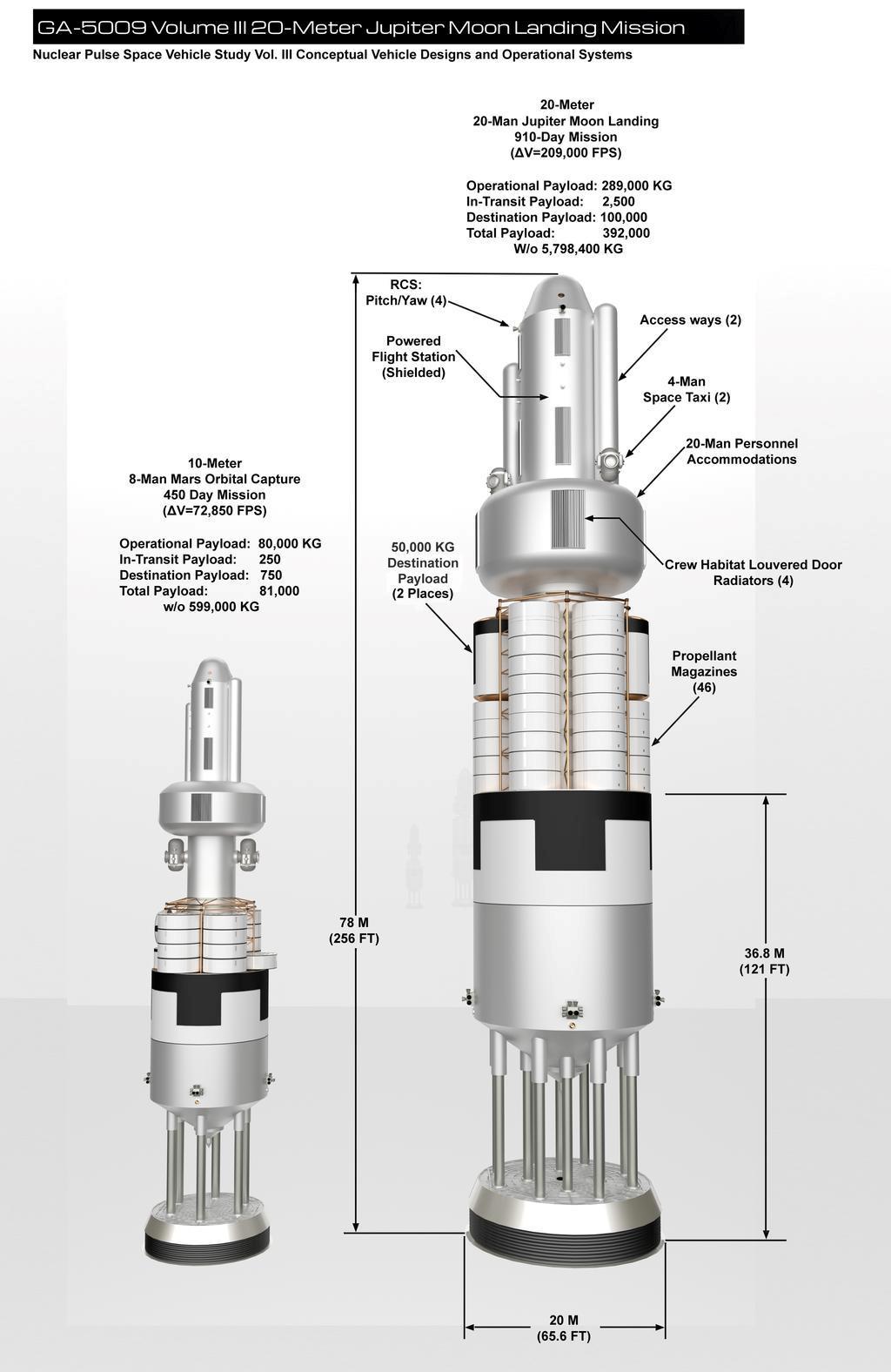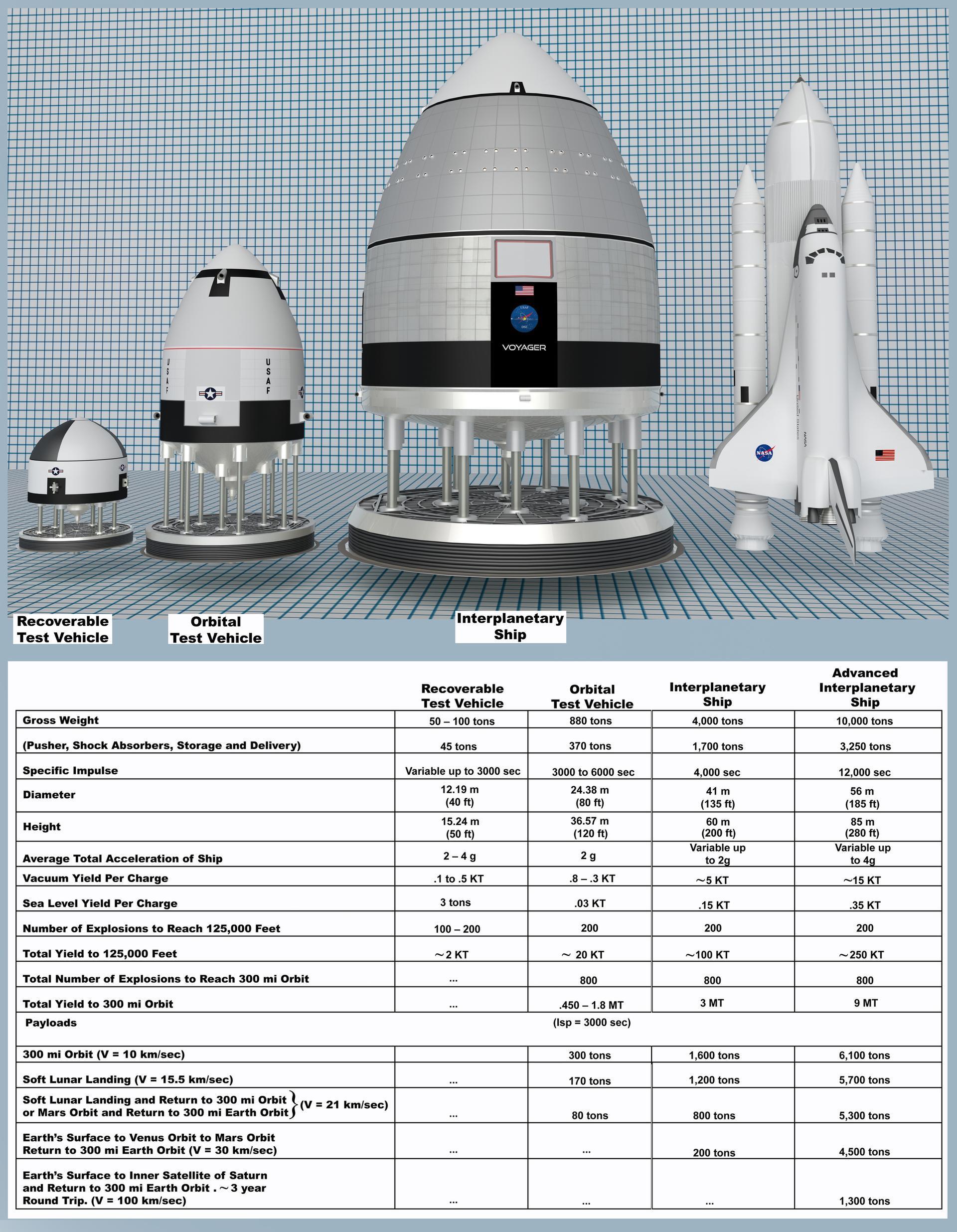 Линейка несостоявшихся проектов. От 100-тонного суборбитального "Ориона" к 4000-тонному. Как видим, главная проблема "Ориона" - очень низкий КПД + радиационное загрязнение. Чтобы запустить 4000-тонник на орбиту, надо взорвать 3 мегатонны в тротиловом эквиваленте. Для 10 000-тонного - уже 9 мегатонн, причем не все они пролетят мимо атмосферы.
