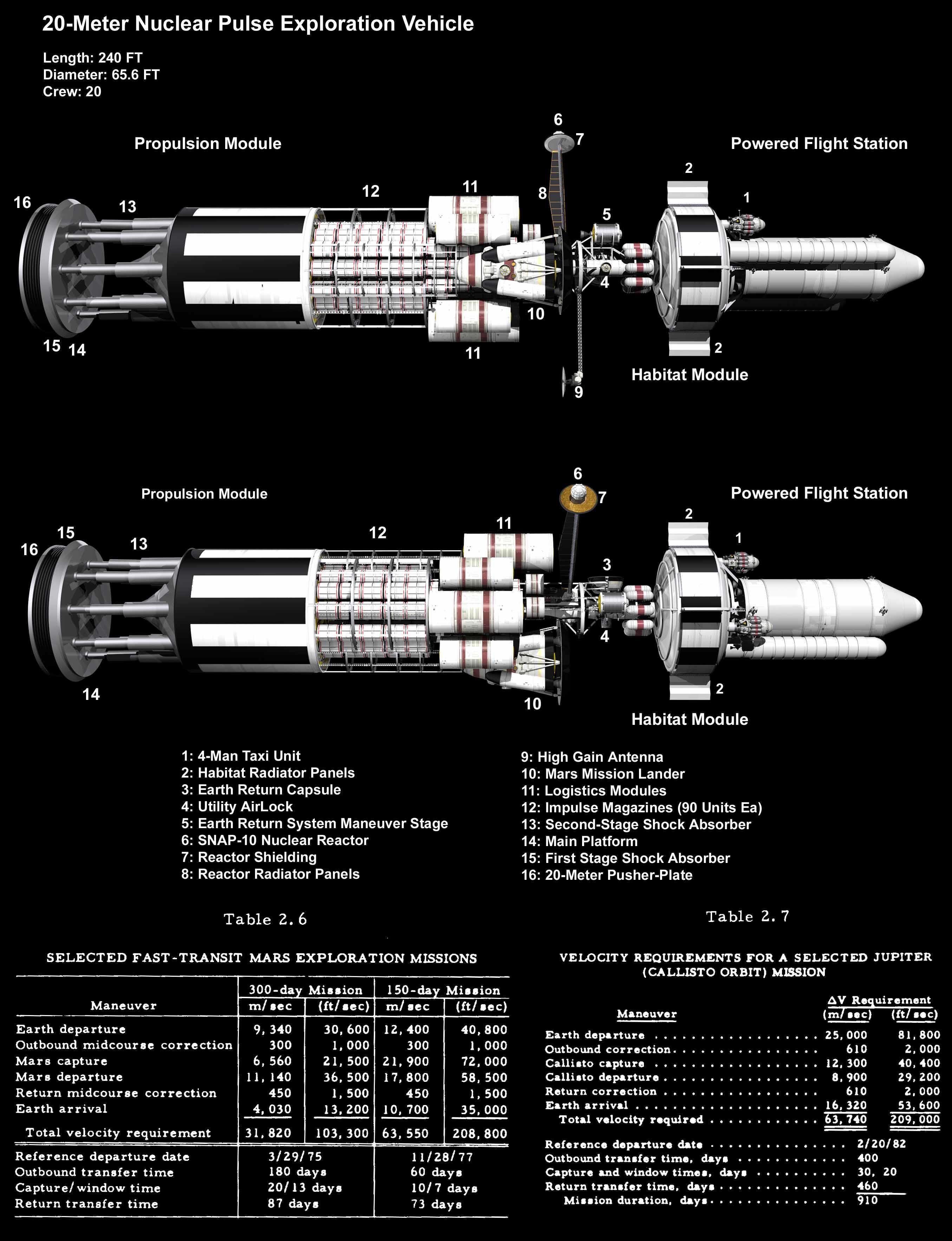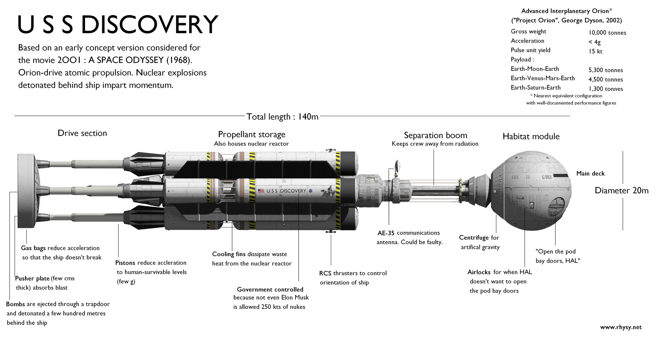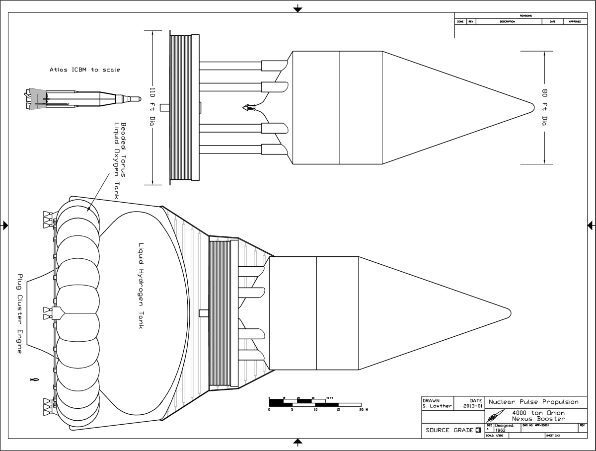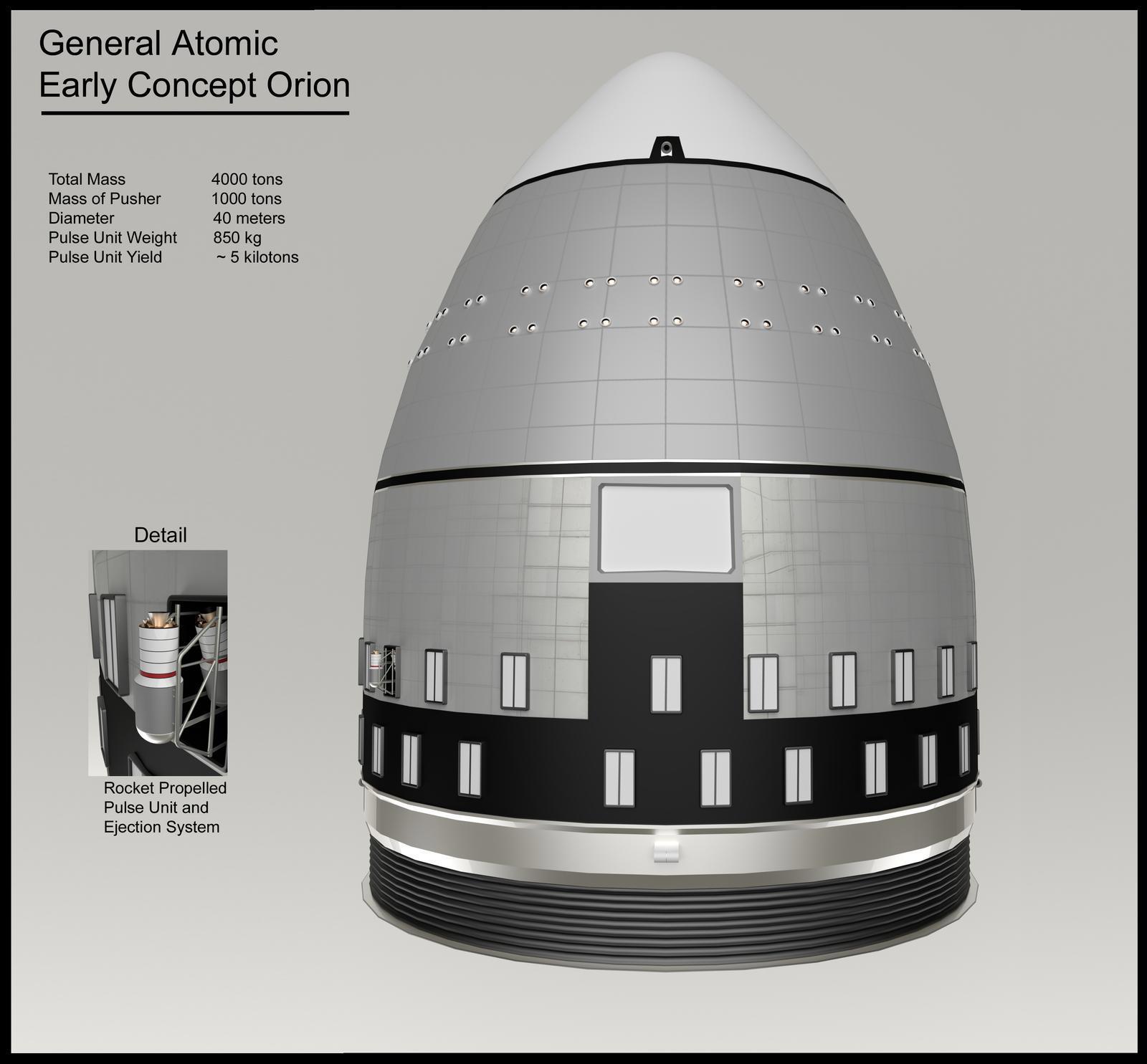 Линейка несостоявшихся проектов. От 100-тонного суборбитального "Ориона" к 4000-тонному. Как видим, главная проблема "Ориона" - очень низкий КПД + радиационное загрязнение. Чтобы запустить 4000-тонник на орбиту, надо взорвать 3 мегатонны в тротиловом эквиваленте. Для 10 000-тонного - уже 9 мегатонн, причем не все они пролетят мимо атмосферы.