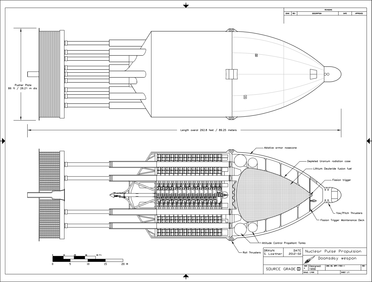 "Орион"-планетоубийца. Должен был нести термоядерный заряд мощностью в 15 гигатонн, способный уничтожить всю жизнь на Земле. Ну, или взорвать немаленьких размеров астероид.