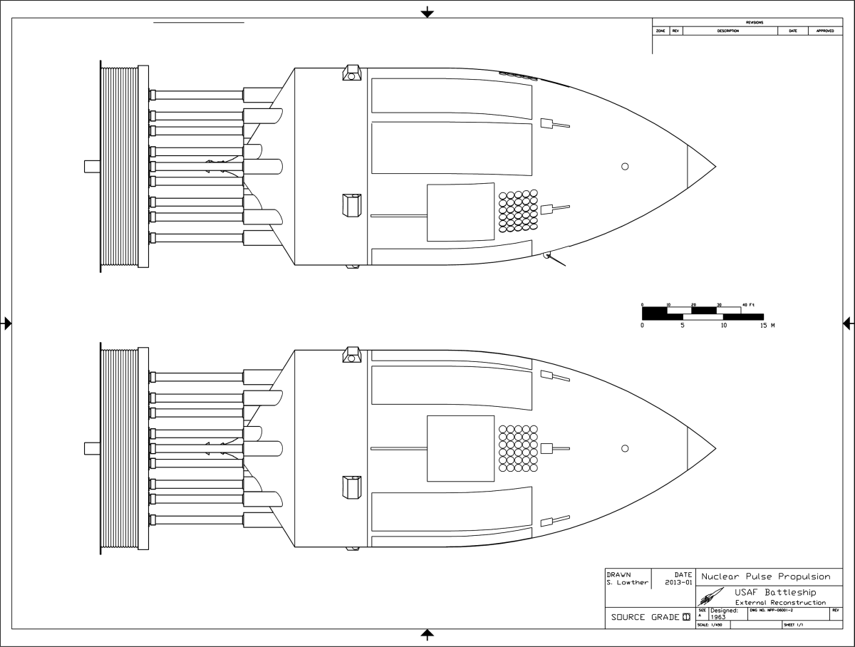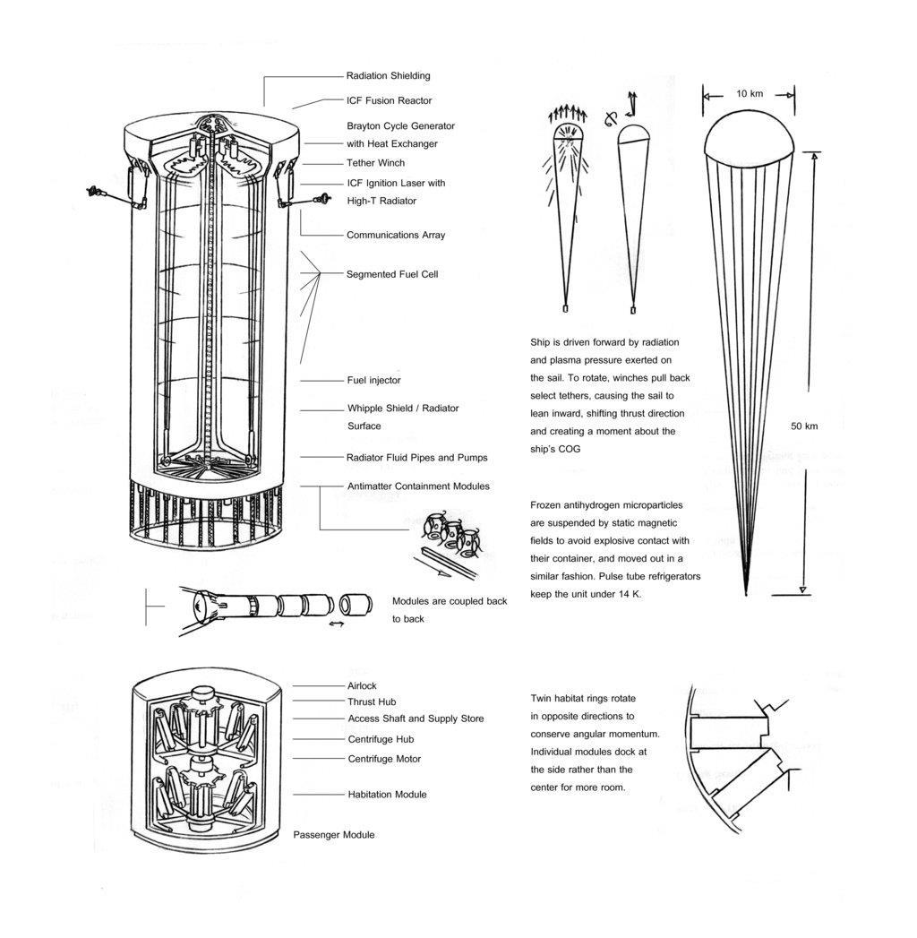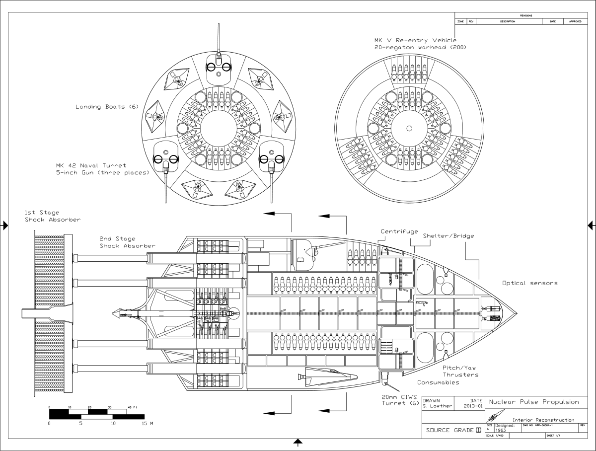 Более подробный чертеж. 200 х 20 мегатонных термоядерных боеголовок, 3 х 127-мм пушки, 6 х 20-мм шестиствольных автоматов "Вулкан", 6 космических истребителей "Дина Соар", даже искусственная гравитация (при помощи бортовой центрифуги, конечно).