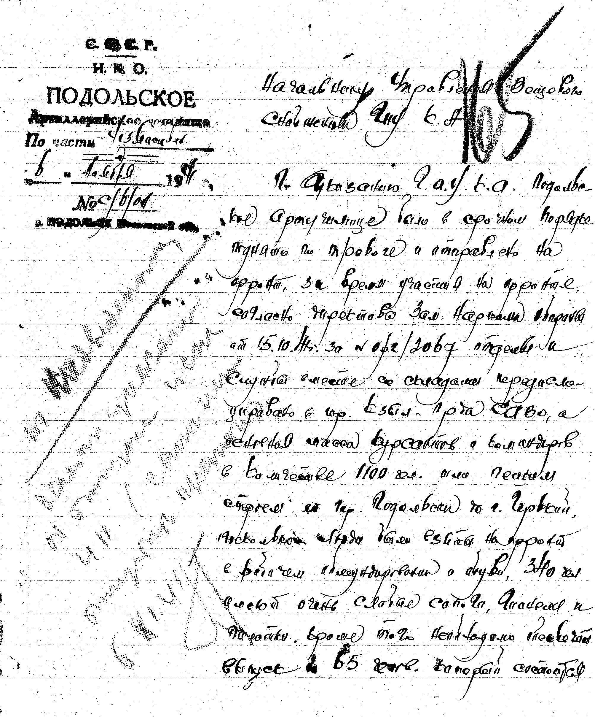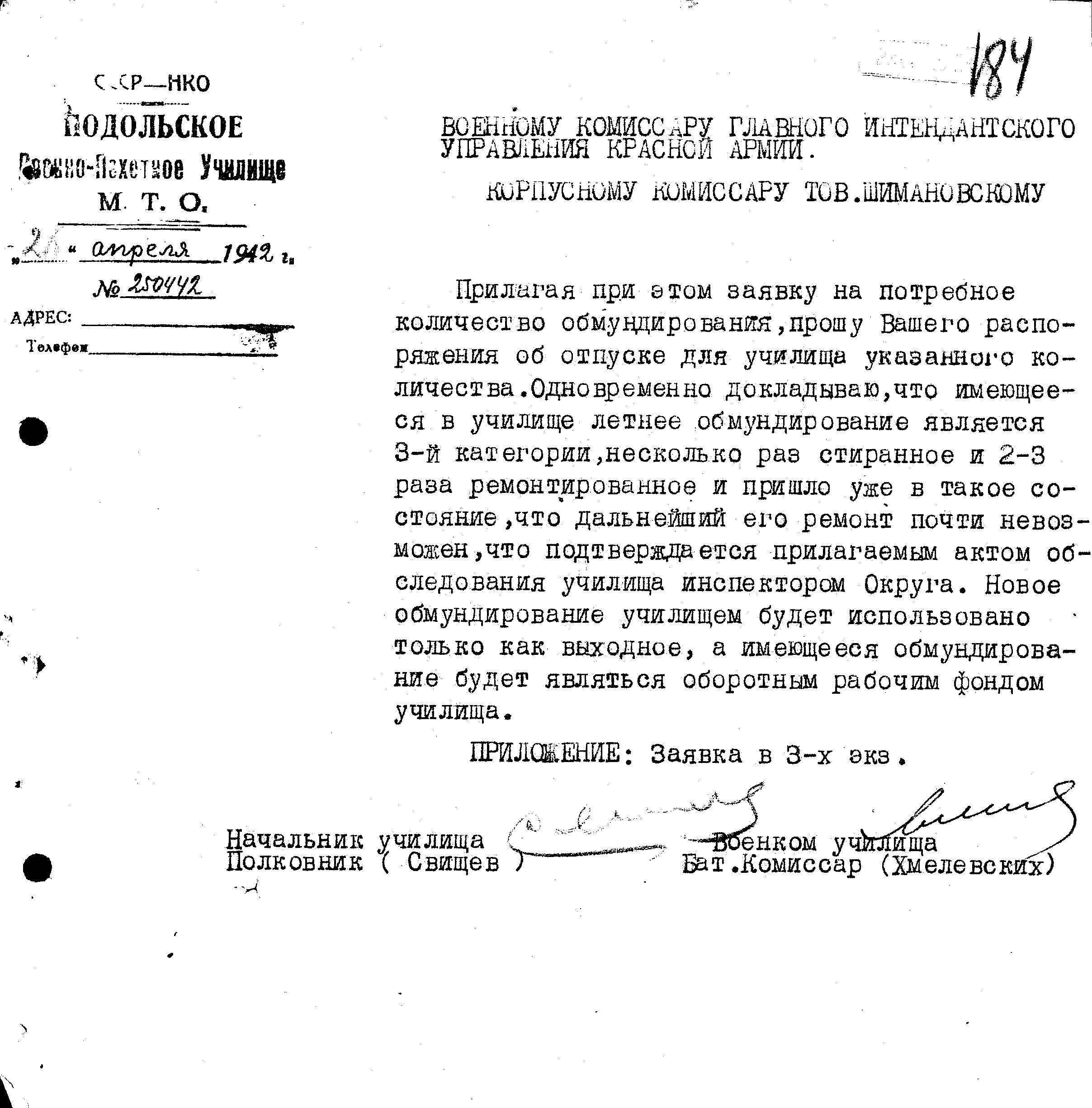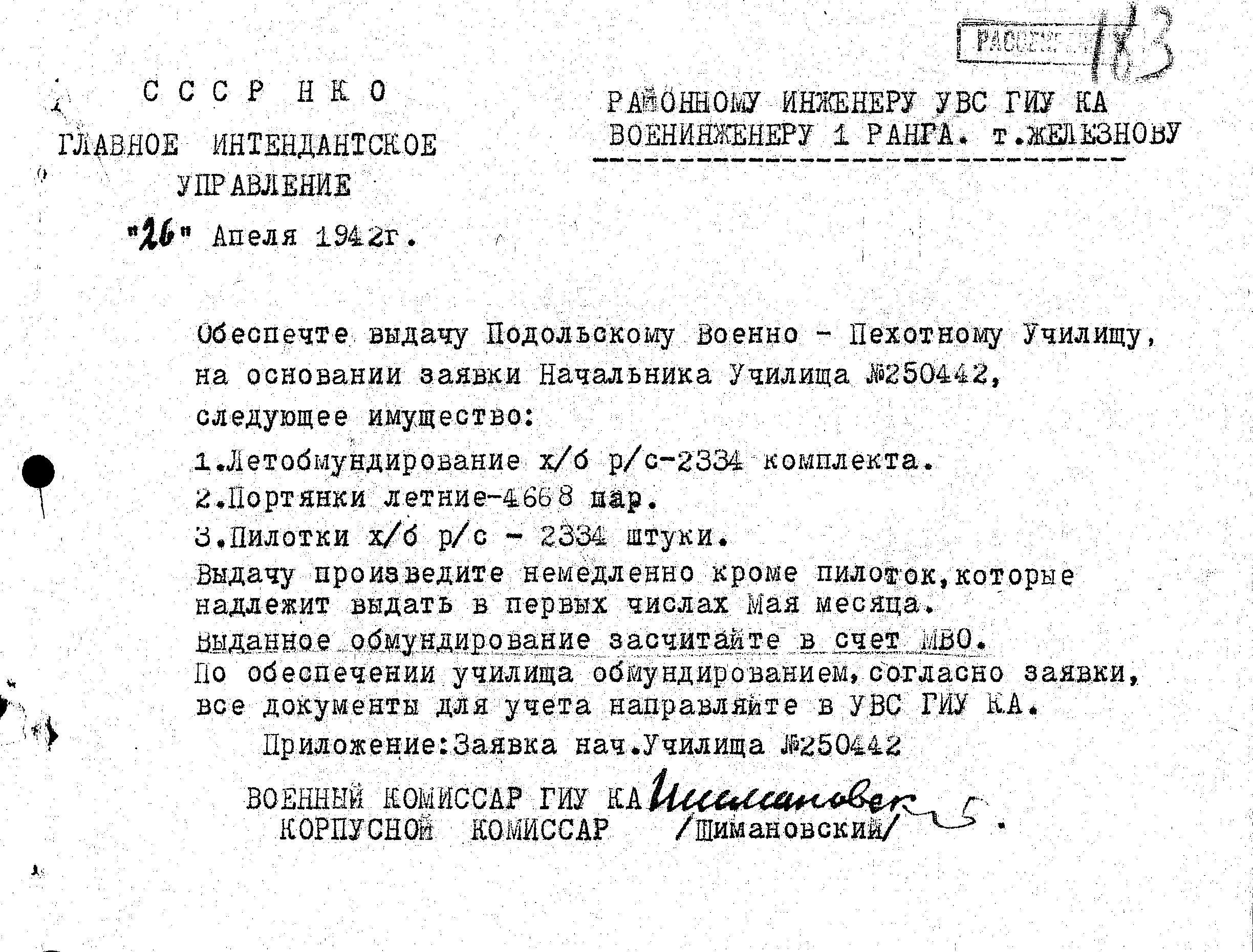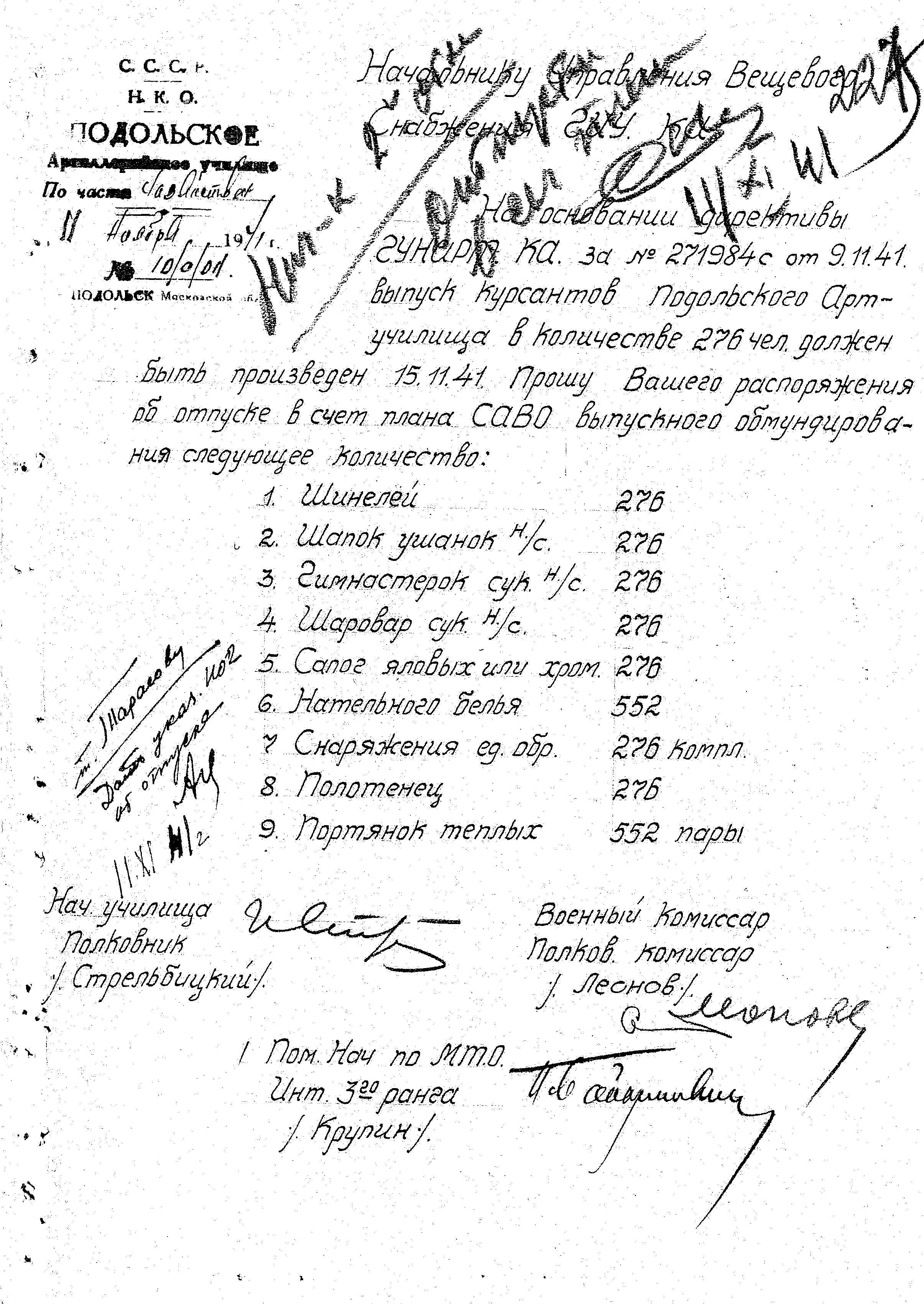 «По приказанию Главного Артиллерийской управления Красной Армии Подольского артучилище было в срочном порядке поднято по тревоге и отправлено на фронт. За время участие на фронте, согласно директивы Зам. Наркома обороны от 15.10.1941 г. за № оф2/2067 отделы и службы вместе со складами передислоцированы в гор. Кзыл Арта САВО, а основная масс курсантов и командиров в количестве 1100 человек шла пешим строем от гор. Подольск до г. Горький. Несколько людей были взяты на фронт в рабочем обмундировании и обуви, 340 чел. Имеют очень слабые сапоги, шинели и пилотки. Кроме того необходимо обеспечить выпуск из 65 человек который состоится завтра а выпускники – лейтенанты будут оставлены здесь. На основании вышеизложенного прошу отпустить:
