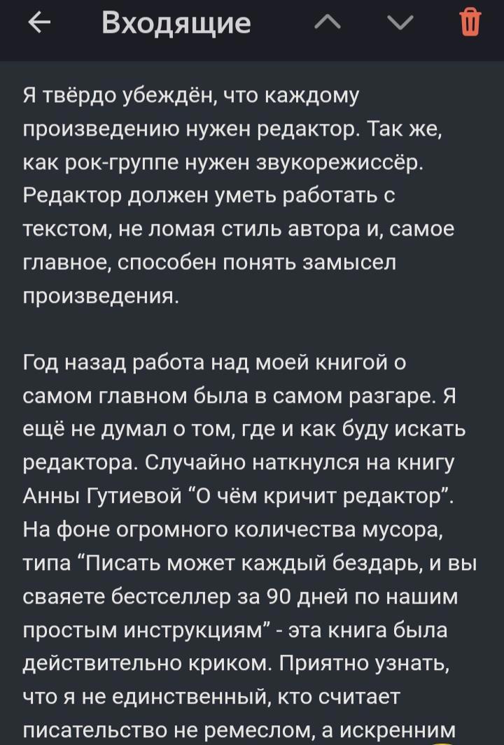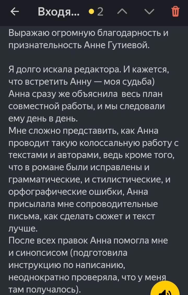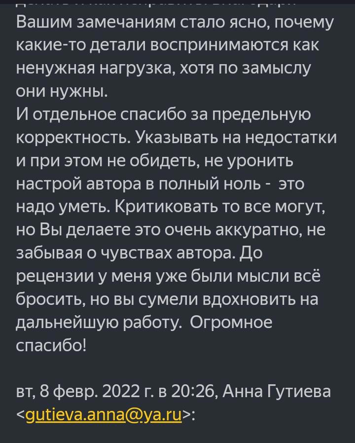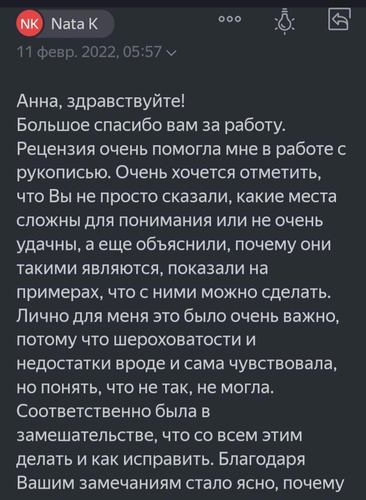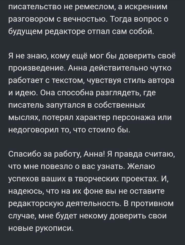Чтобы не расписывать самой, что я и как делаю, оставлю здесь последние отзывы от авторов замечательных текстов, с которыми довелось поработать. Пишите, пожалуйста, на почту gutieva-anna@yandex.ru