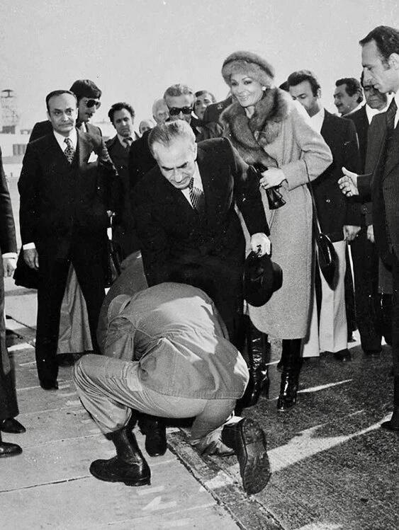 16 января 1979 года, Иран. Шах за несколько минут до своего последнего отлёта из страны. В ноги ему бросился один из верноподданных слуг, офицер шахской гвардии, умоляя монарха не покидать страну. Закутанная в меха шахиня весело улыбается (жива и сейчас).