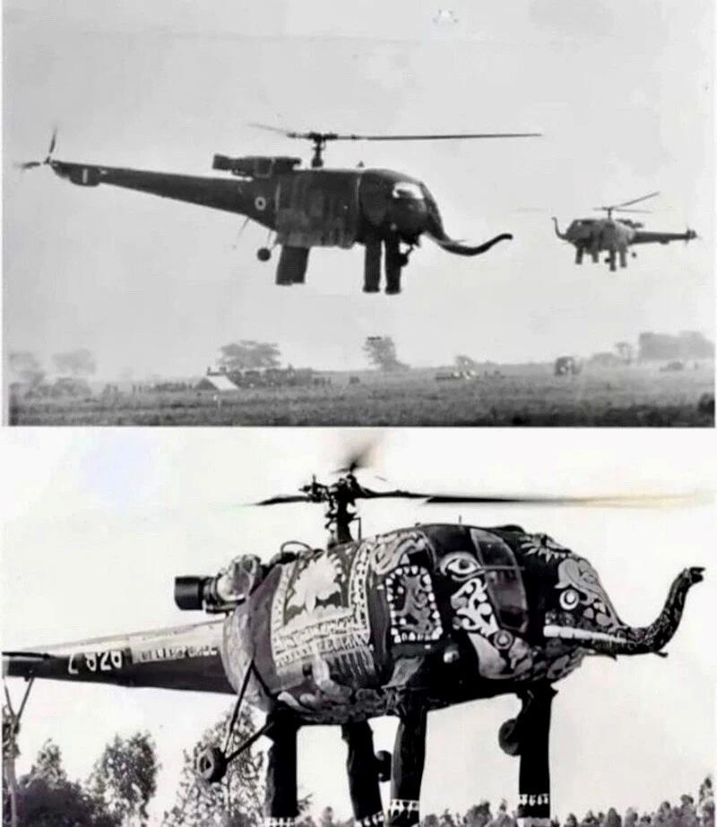 1970-е годы, Индия. Учения ВВС, французские вертолёты Alouette III «одеты» в священных слонов.