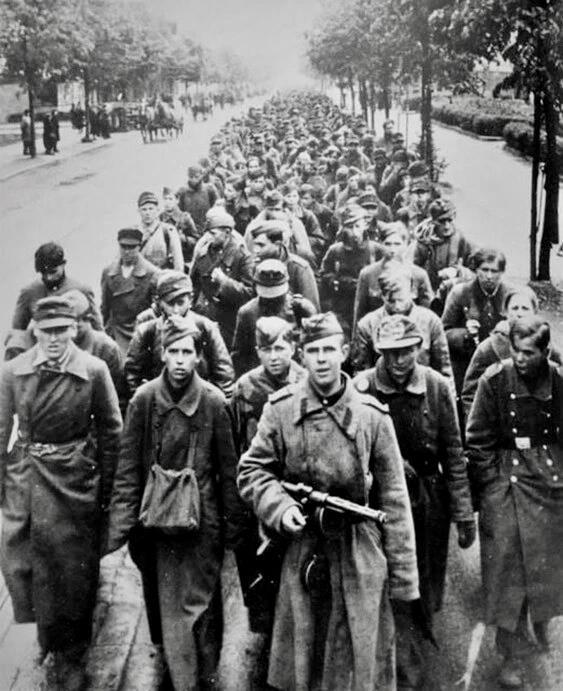 Май 1945 года, Берлин, районе Райниккендорф. Ефрейтор (?) Красной Армии с пистолетом-пулеметом ППД ведет колонну немецких военнопленных по улице.