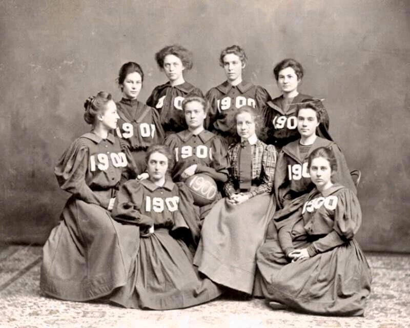 1900 год, США. Женская баскетбольная команда. Примечательно, что они играли в платьях с длинными рукавами и надевали корсеты.