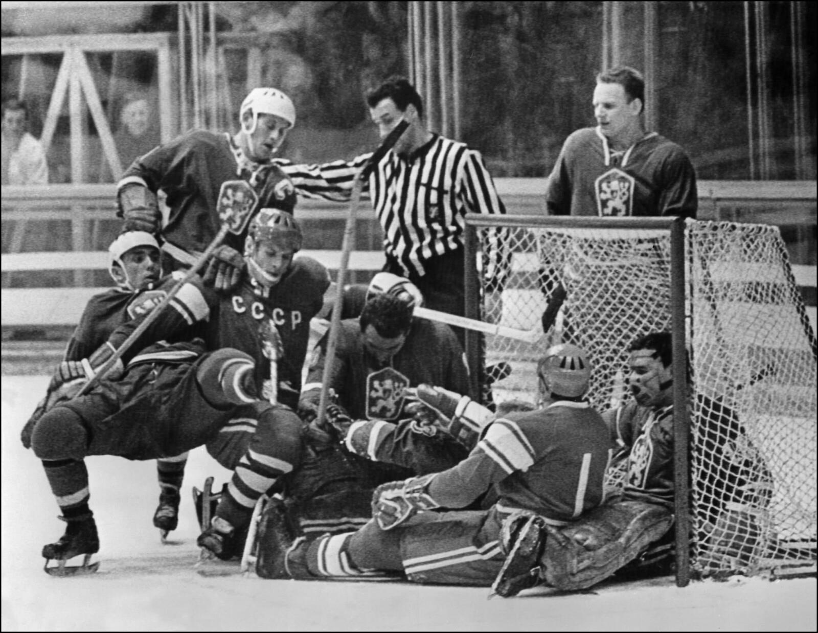 15 февраля 1968 года. Куча мала перед чешскими воротами, когда судья останавливает игру во время хоккейного матча между СССР и Чехословакией на зимних олимпийских играх в Гренобле. Чешская команда обыграла действующих олимпийских чемпионов со счетом 5:4.