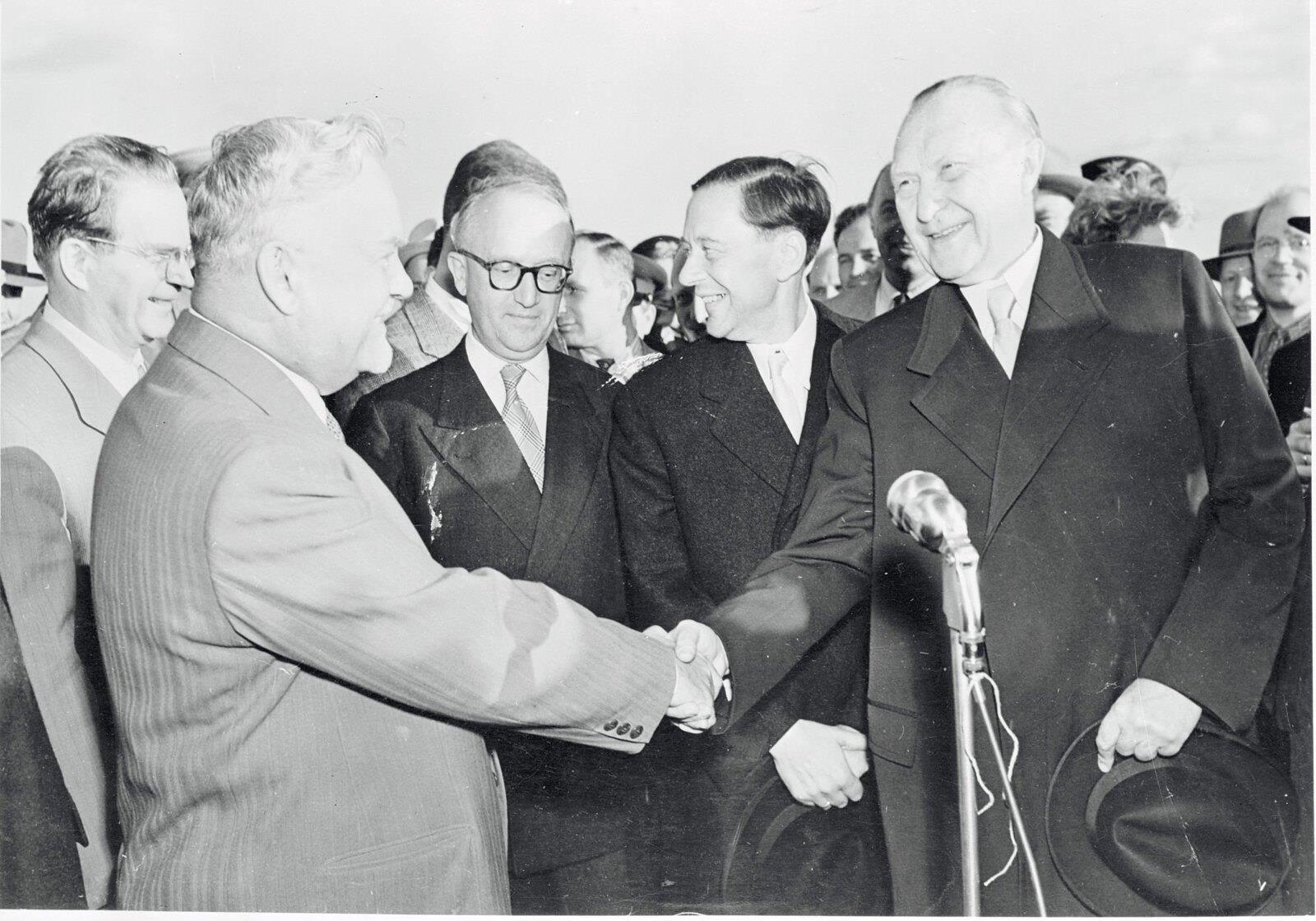 1955. Н.А.Булганин приветствует Канцлера Германии Конрада Аденауэра в аэропорту Внуково.