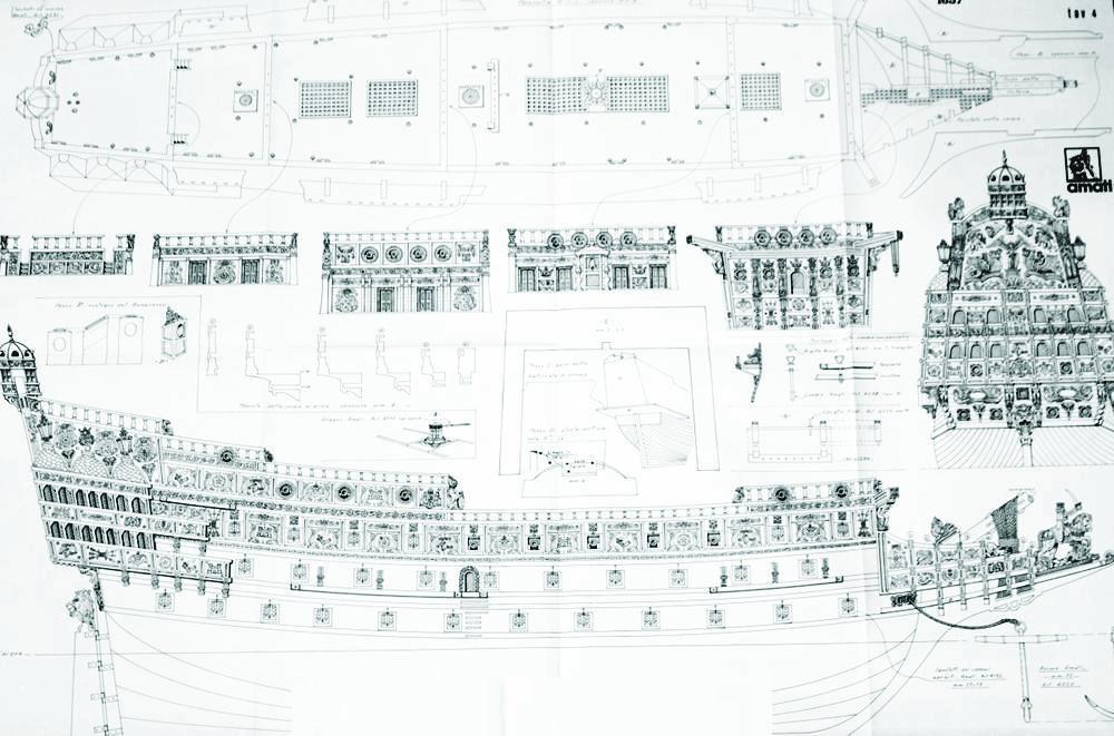 Ну а 17 век с его развитием кораблестроения породил чертежников, которые заткнут за пояс многих современных. Ниже довольно широко известный в узких кругах чертеж Солей Руаяля, красы и гордости французского флота начала 17 века.