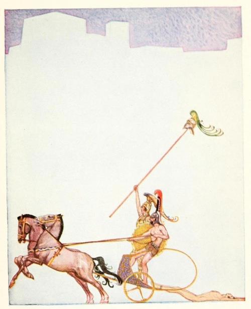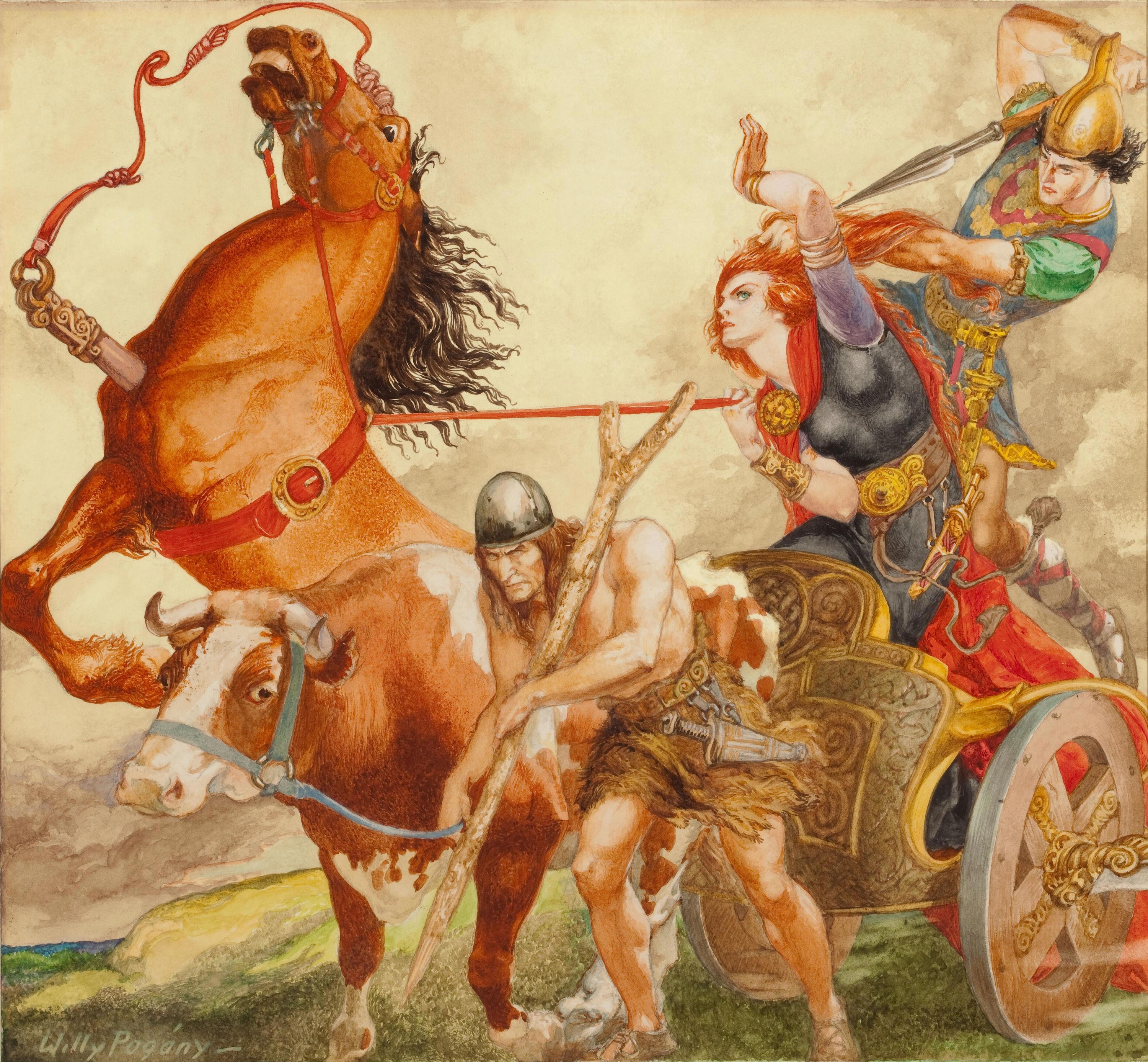 На колеснице сидела красная женщина. У нее были красные брови, красный плащ и красное платье. Плащ ее свисал сзади между колесами и мел землю. Рядом с колесницей шел высокий мужчина в красной одежде. Он нес на плече копья и вилы и гнал впереди себя корову».
