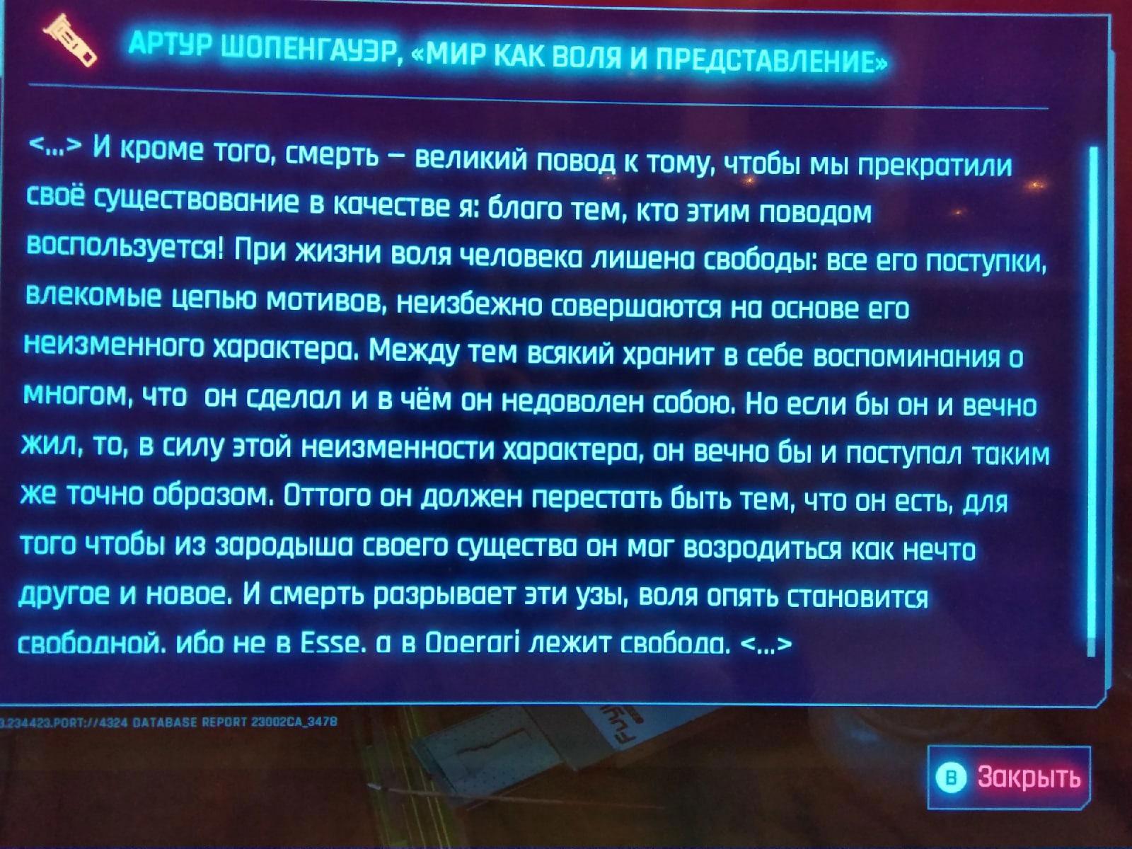 Автор: Алексей СысоевВ игре Cyberpunk 2077 среди записок и сообщений, разбросанных по миру игры, внезапно обнаружился отрывок из Шопенгауэра, весьма интересный. Философ вдруг смог объяснить смысл реинкарнации.
