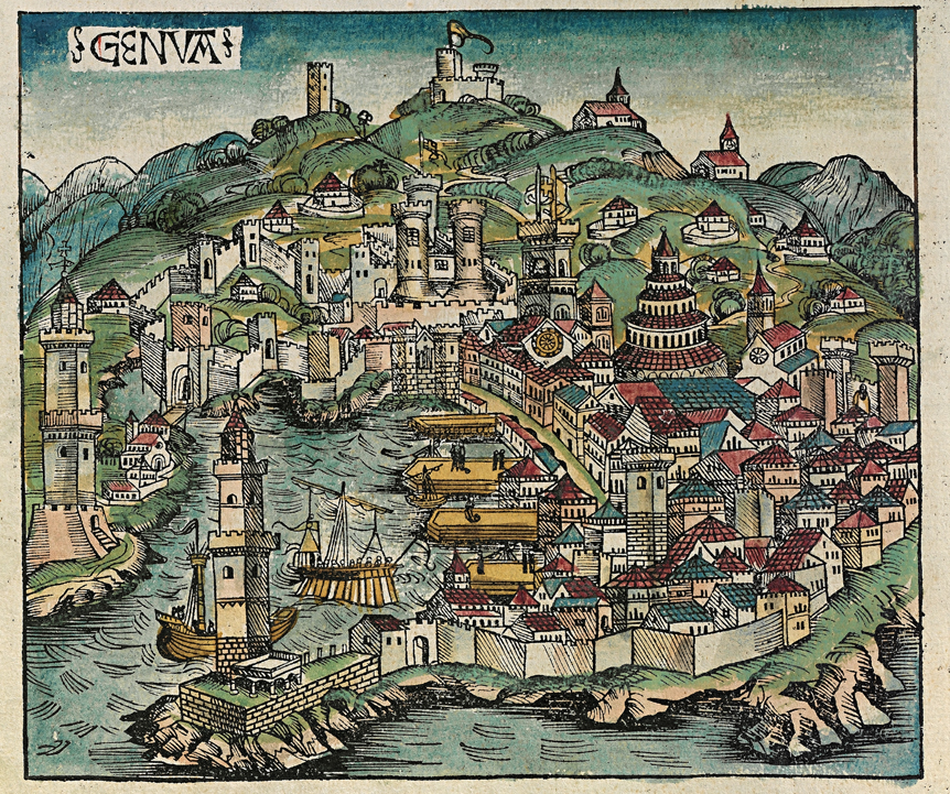 Генуя в конце XV века. Миниатюра из "Нюрнбергской хроники" 1493 года.