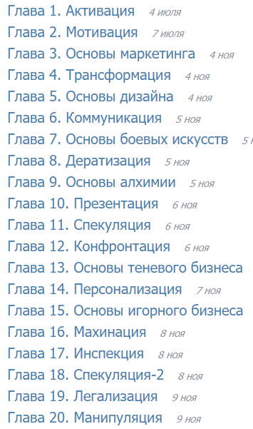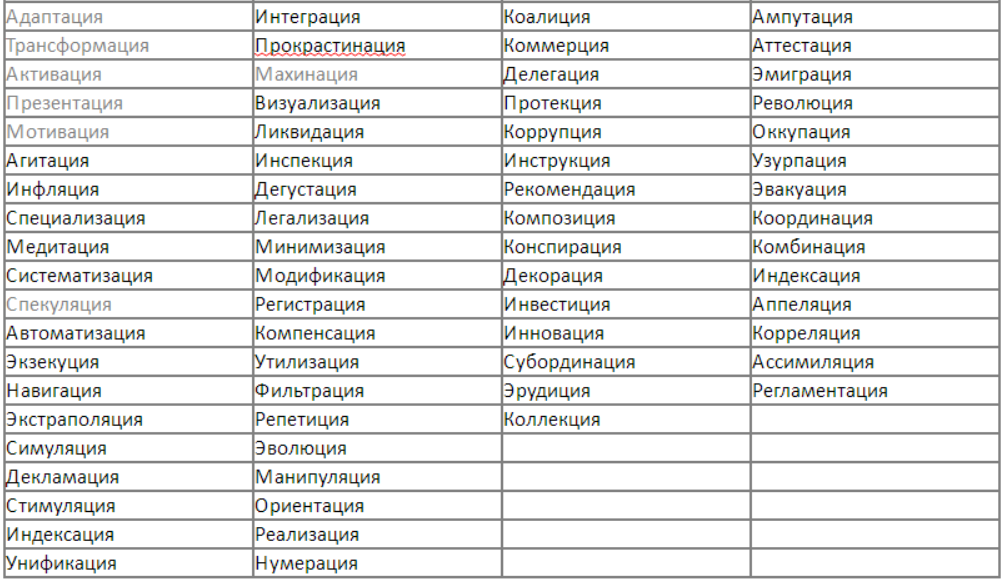 Правда, еще глав через 5-6 это перестало казаться забавным и стало совсем не прикольным, потому как попробуй найди или подбери подходящую "-цию", да еще и со смыслом! Поэтому я завел специальный блокнотик, куда просто выписывал все более-менее подходящие слова, чтобы в него подсматривать.