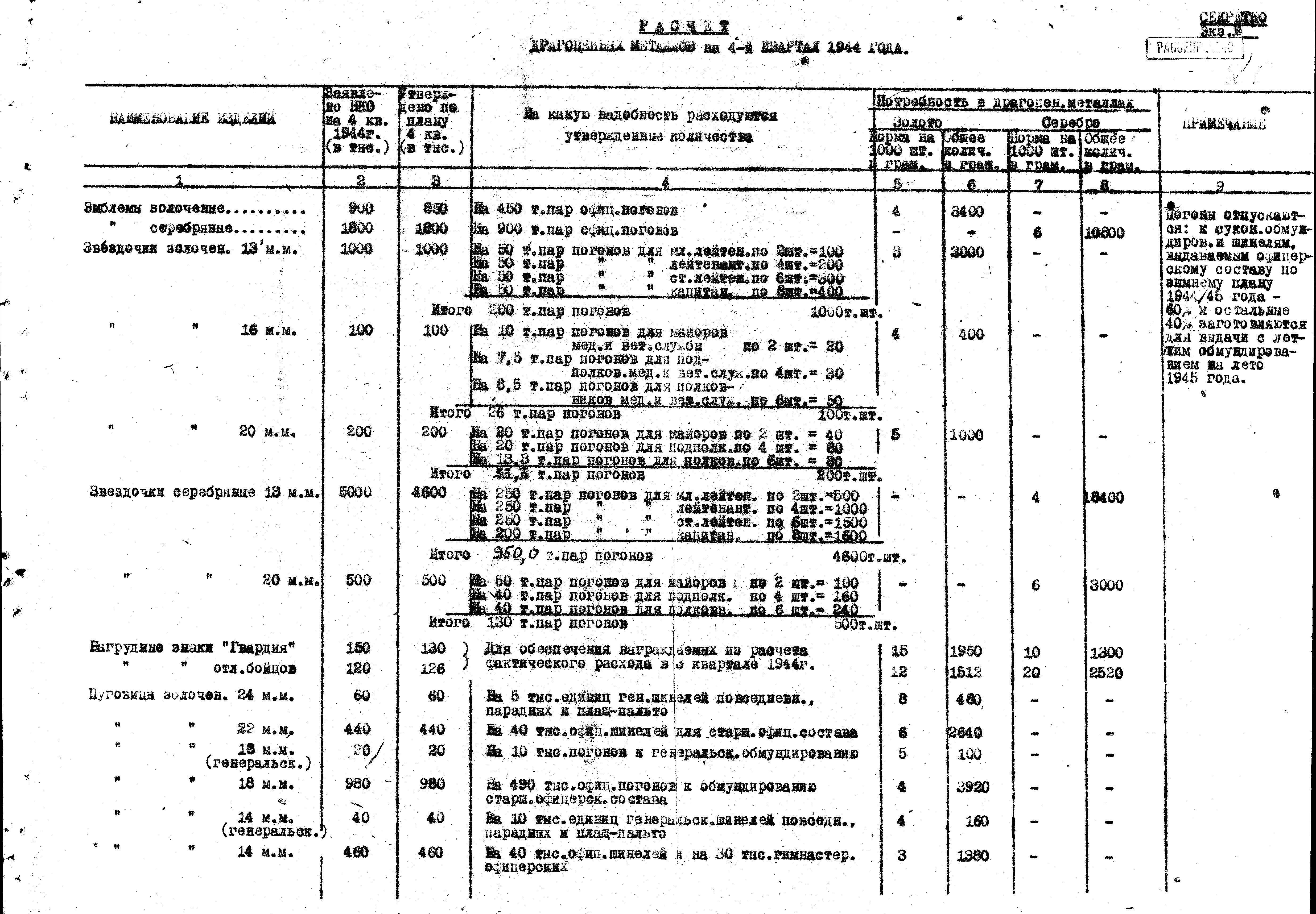 д/с: Расчёт драгоценных металлов на 4-й квартал 1944 г.
