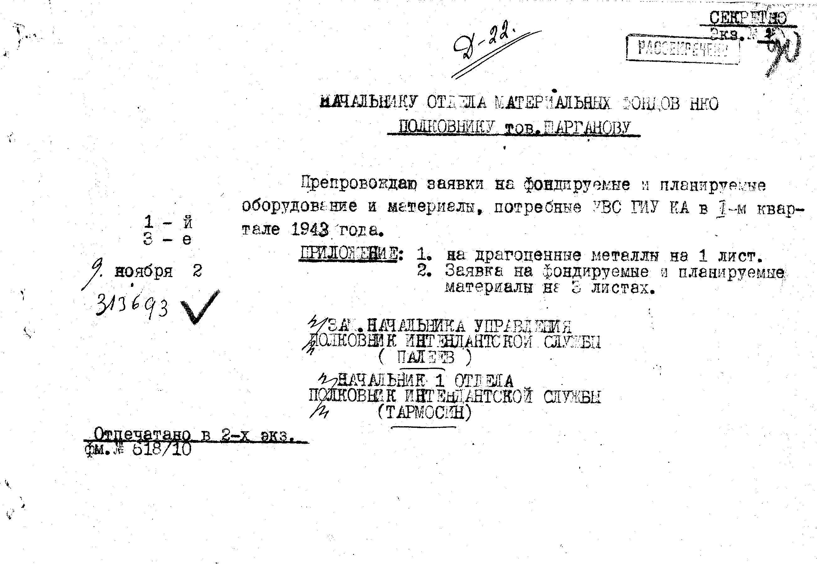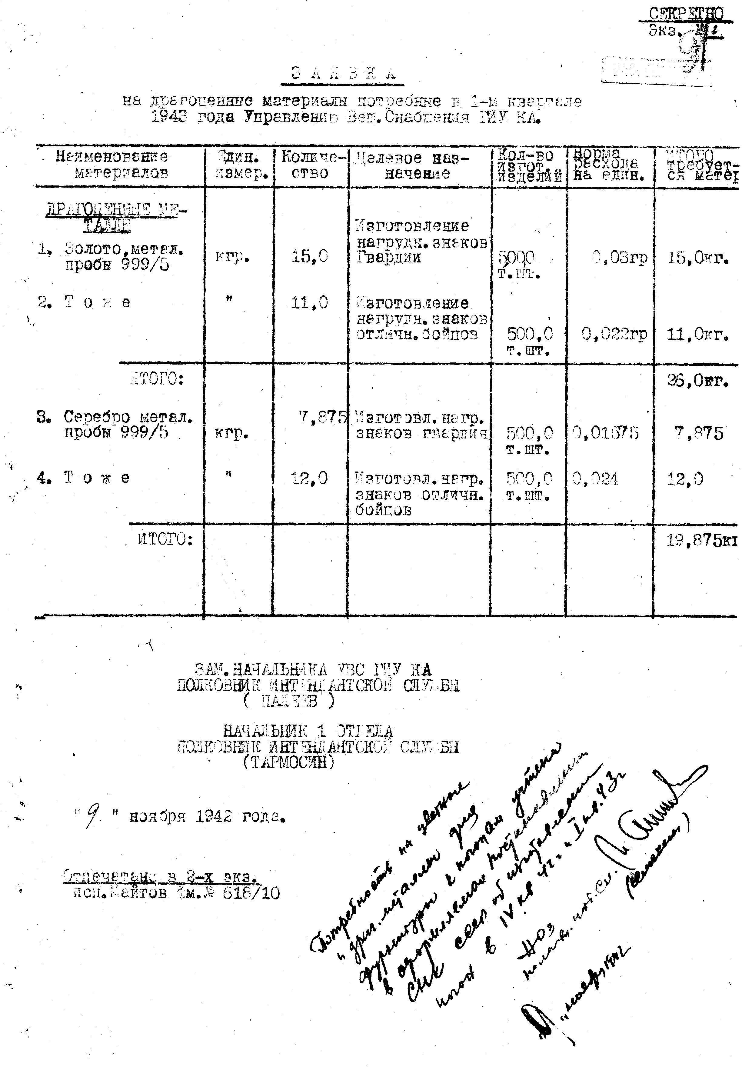 д/с: Заявка на драгоценные металлы, потребные в 1-м квартале 1943 года
